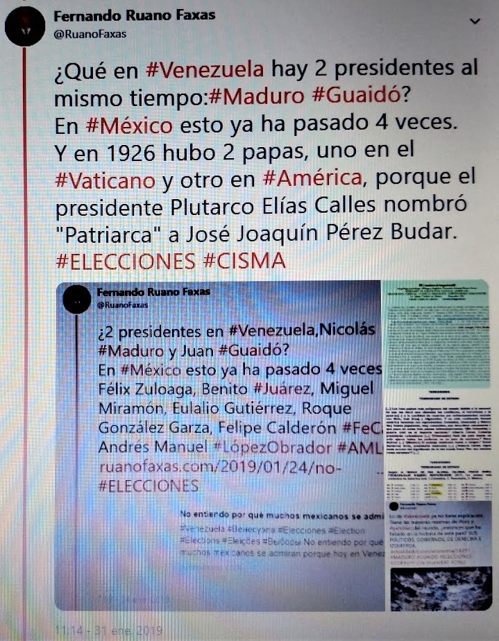 FERNANDO ANTONIO RUANO FAXAS. VENEZUELA, MADURO, GUAIDÓ, MÉXICO, ZULOAGA, JUÁREZ, MIRAMÓN, GUTIÉRREZ, GONZÁLEZ GARZA, FELIPE CALDERÓN, LÓPEZ OBRADOR, JOSÉ JOAQUÍN PÉREZ BUDAR, PATRIARCA, PAPA, VATICANO, CISMA