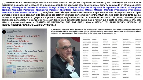 […] Bueno no, en realidad aquí en los medios de comunicación de Estados Unidos casi no se habla ni en idioma español y mucho menos en idioma inglés de los intelectuales mexicanos, y eso que aquí en este país hay más de 40 millones de mexicanos, es decir entre mexicanos nacidos en México y sus descendientes, y que somos en total aproximadamente 70 millones de latinos, y de éstos somos hispanos unos 56 millones. Pero tienes que tomar en cuenta que el analfabetismo y el analfabetismo funcional están a la orden del día en este país. Si muchos intelectuales, como Isabel Allende, e investigadores reconocidos dicen que el presidente Donald Trump en un analfabeto funcional que no sabe leer, imagínate cómo andará este asunto de educación y cultura en “el pueblo”, entre “los gringos blancos”, y no hablemos ya de “los gringos negros” y los migrantes, muchos de ellos indígenas que solo hablan bien sus lenguas amerindias de sus países de origen, y que medio hablan español y que ni entienden ni hablan inglés. En Estados Unidos se cree que hay unos 93 millones de personas que tienen algún tipo de analfabetismo, se dice que son 50 millones de estadounidenses con analfabetismo funcional #AnalfabetismoFuncional y 43 millones con analfabetismo #Analfabetismo. ¡Imagínate cómo andará este desastre educativo y cultura en México, en América Latina! ¡Triste y terrible! […] Aquí en Estados Unidos es raro oír o ver alguna información acerca de los intelectuales mexicanos. Claro, sí se habla de México, porque Donald Trump siempre está mencionando a los migrantes, a los indocumentados, a la frontera, al muro o wall, al narcotráfico, a los violadores, a los delincuentes, es decir todas estas pendejadas de las que este presidente idiota, como Vicente Fox, siempre está hablando, para desviar la atención de su verdadero problemototote, que es esto de que él llegó al poder gracias a Rusia, a Putin, todo esto que ha investigado Mueller y que sigue dando de qué hablar, que no termina ni terminará nunca, una larga historia con implicaciones que todavía no se sabe hasta dónde llegarán, que muchos republicanos han querido dar a entender que ya terminó y justamente es cuando está empezando. Obviamente, hay medios importantes aquí en Estados Unidos que presentan a periodistas mexicanos conocidos internacionalmente, como Carmen Aristegui. De ahí no pasa […] Yo venía por la autopista, a veces oigo información en idioma español, de América Latina y del mundo, oigo a Aristegui, para estar bien informado, porque imagínate lo que sería confiar en la información que dan los periodistas y comunicadores chayoteros, embuteros, de México, estaría perdido, es como desinformarse, perder el tiempo […] sí, claro, a Alfredo Jalife lo conozco, es brillante, mis respetos, tiene una cultura atípica para México, para toda América Latina y buena parte del mundo. Jalife es una persona que, te guste o no, estés de acuerdo con él o no, tienes que oírlo, este tipo es como una enciclopedia humana, siempre dice algo que mueve fuerte el tapete, le caiga el sombrero a quien le caiga, a la hora de hablar Jalife primero dispara y después apunta, no tiene paz con nadie. Y, claro, esto no les conviene a los que no piensan como él y tienen largas colas que les pisen. A mí me encanta, y eso que yo no tengo paz con nadie, y menos con las dictaduras, y menos con los corruptos, con todos esos hijos de su puta madre que han llevado a América Latina al hueco negro, pestilento y lleno de mierda en el que está. Los jerarcas del catolicismo en México ven a Alfredo Jalife como un demonio. A ellos no les conviene todo lo que dice Jalife acerca de los curas, de los sacerdotes pedófilos, violadores de niños, como Marcial Maciel y sus cómplices los Legionarios de Cristo y el cardenal Norberto Rivera Carrera. Y sí, está más que claro que muchos judíos mexicanos quisieran quemar con leña verde a Jalife: “y los sueños, sueños son” […] Y, te repito, en cuanto a cultura integral, en cuanto a polimatía, en México ha habido en los últimos años dos geniales intelectuales: Ikram Antaki y Alfredo Jalife. También hay otros, pero en cuanto a “sólida cultura integral internacional” no les llegan a estos dos. Por supuesto, Ikram Antaki y Alfredo Jalife siempre fueron dos polos opuestos, no podían verse ni en pintura, pero los dos son geniales, siempre me encantaron los dos, y eso que muchas veces no estaba de acuerdo con lo que ellos decían, pero oírlos y verlos hablar siempre fue una delicia. ¡Qué pena que Ikram Antaki haya muerto! Imagínate poder oír y ver hablar a dos personajes como Antaki y Jalife, y más en un país como México, en donde el cantinflear, las cantinfladas, es decir el hablar boberías, mierda, está a la orden del día, es pan nuestro de cada día, es prácticamente norma lingüística, es decir bla, bla, bla, bla, bla…, hablar y hablar y no decir nada, te aburren, te duermes, caes en coma, terrible. Cantinflear, cantinfleo, cantinflada, es algo que he definido como el estado del papaloteo mental, papalotear mentalmente. En el lenguaje verbal y en el lenguaje corporal de los mexicanos, en general y en cualquier contexto, tal pareciera que por encima de la precisión siempre imperará la imprecisión: nunca un “el”, nunca un “la”, nunca un “los”, nunca un “ese”, nunca un “esa”, nunca un “esos”, y siempre un “un”, un “una”, un “unos” […] es algo así como un “sí, pero no” y un “no, pero sí” […] Imagínate nada más, ahora resulta que 142 “intelectuales” mexicanos mandan una carta al presidente Andrés Manuel López Obrador, AMLO, para pedirle que no incluya a Alfredo Jalife en su gobierno, que no le dé ningún puesto. ¡Mírame nada más a lo que se atreven! Y cuando oyes o lees que fueron unos “intelectuales” los que mandaron esta carta, enseguida piensas, sobre todo, en literatura y pe
