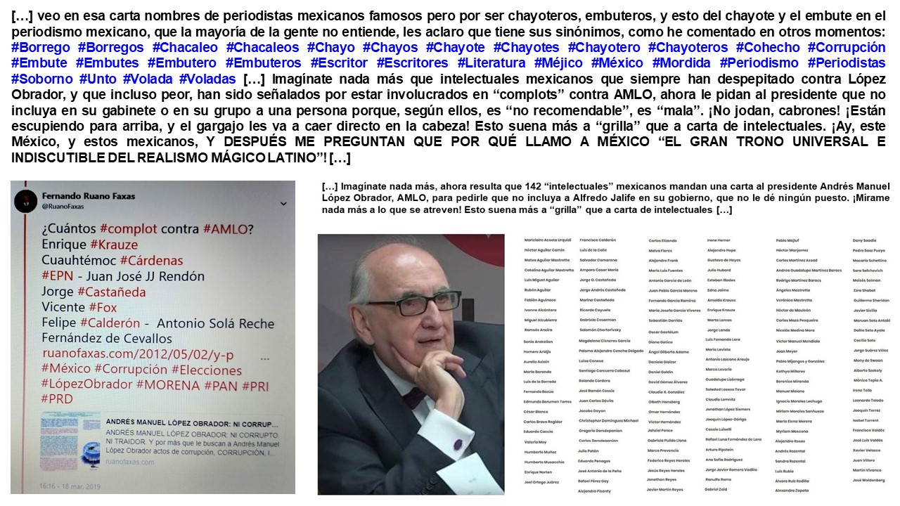 ← back to “Imagínate nada más, ahora resulta que 142 “intelectuales” mexicanos mandan una carta al presidente Andrés Manuel López Obrador, AMLO, para pedirle que no incluya a Alfredo Jalife en su gobierno, que no le dé ningún puesto. ¡Mírame nada más a lo que se atreven! Esto suena más a “grilla” que a carta de intelectuales.”