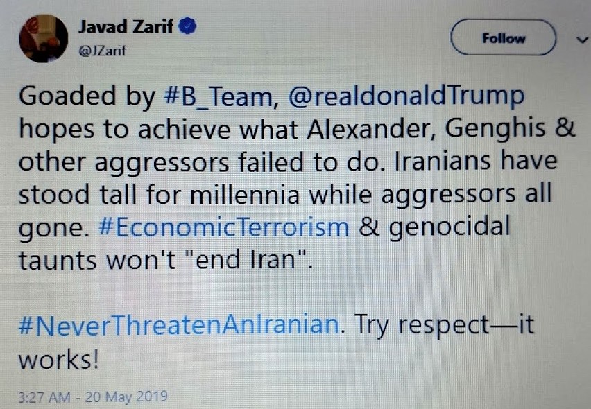 TERRORISM, COLD WAR. Javad Zarif. Trump hopes to achieve what Alexander, Genghis & other aggressors failed to do. Iranians have stood tall for millennia while aggressors all gone. #NeverThreatenAnIranian. Try respect—it works!