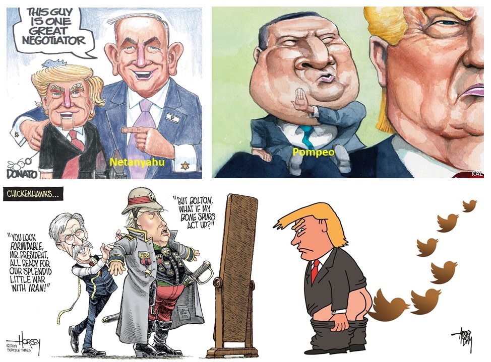 Trump, Netanyahu, Israel, Iran, Hassan Rouhani, Ali Khamenei, John Bolton, Mike Pompeo, Mike Pence, Mueller, FBI, Russia, Putin, Election, Impeachment, Leadership, Management, Twitter, Cartoon, Cartoons, China, Xi Jinping