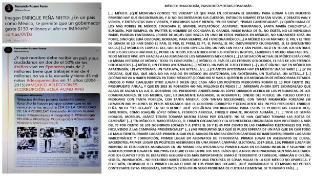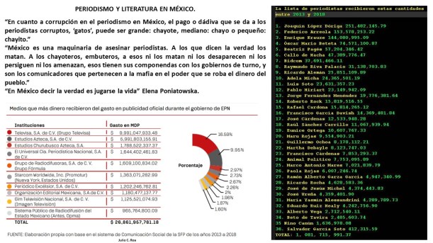 […] Imagínate en qué situación de pobreza y miseria está México que tiene un salario mínimo menor que el de Honduras, El Salvador y Guatemala. Imagínate en qué situación está un país como México que teniendo el PRIMER LUGAR A NIVEL INTERNACIONAL EN MIGRACIÓN FORZADA CONSTANTE, porque la gente se va de su país debido a que no hay trabajo, y el que hay, el narcotráfico, es riesgo inminente de muerte o cárcel, y así y todo el gobierno de Peña Nieto dio a 36 periodistas mexicanos la cantidad de 1,081 millones de pesos por concepto de publicidad y comunicación. Imagínate en qué situación de crisis y colapso está México cuando su presidente, Enrique Peña Nieto, gasta 130 millones de pesos al año por concepto de “imagen”. ¡De la chingada el asunto! […]