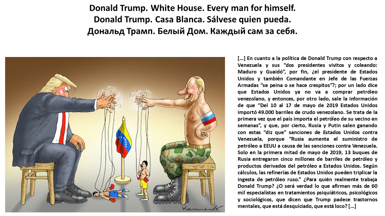 ← back to “XIX. Donald Trump en imágenes. Donald Trump in pictures. Donald Trump em imagens. Дональд Трамп в картинках. https://lnkd.in/ewKRn92 , https://lnkd.in/euWvjnk. […] En cuanto a la política de Donald Trump con respecto a Venezuela y sus “dos presidentes vivitos y coleando: Maduro y Guaidó”, por fin, ¿el presidente de Estados Unidos y también Comandante en Jefe de las Fuerzas Armadas “se peina o se hace crespitos”?; por un lado dice que Estados Unidos ya no va a comprar petróleo venezolano, y entonces, por otro lado, sale la información de que “Del 10 al 17 de mayo de 2019 Estados Unidos importó 49.000 barriles de crudo venezolano. Se trata de la primera vez que el país importa el petróleo de su vecino en semanas”, y que, por cierto, Rusia y Putin salen ganando con estas “diz que” sanciones de Estados Unidos contra Venezuela, porque “Rusia aumenta el suministro de petróleo a EEUU a causa de las sanciones contra Venezuela. Solo en la primera mitad de mayo de 2019, 13 buques de Rusia entregaron cinco millones de barriles de petróleo y productos derivados del petróleo a Estados Unidos. Según cálculos, las refinerías de Estados Unidos pueden triplicar la ingesta de petróleo ruso.” ¿Para quién realmente trabaja Donald Trump? ¿O será verdad lo que afirman más de 60 mil especialistas en tratamientos psiquiátricos, psicológicos y sociológicos, que dicen que Trump padece trastornos mentales, que está desquiciado, que está loco? […]”