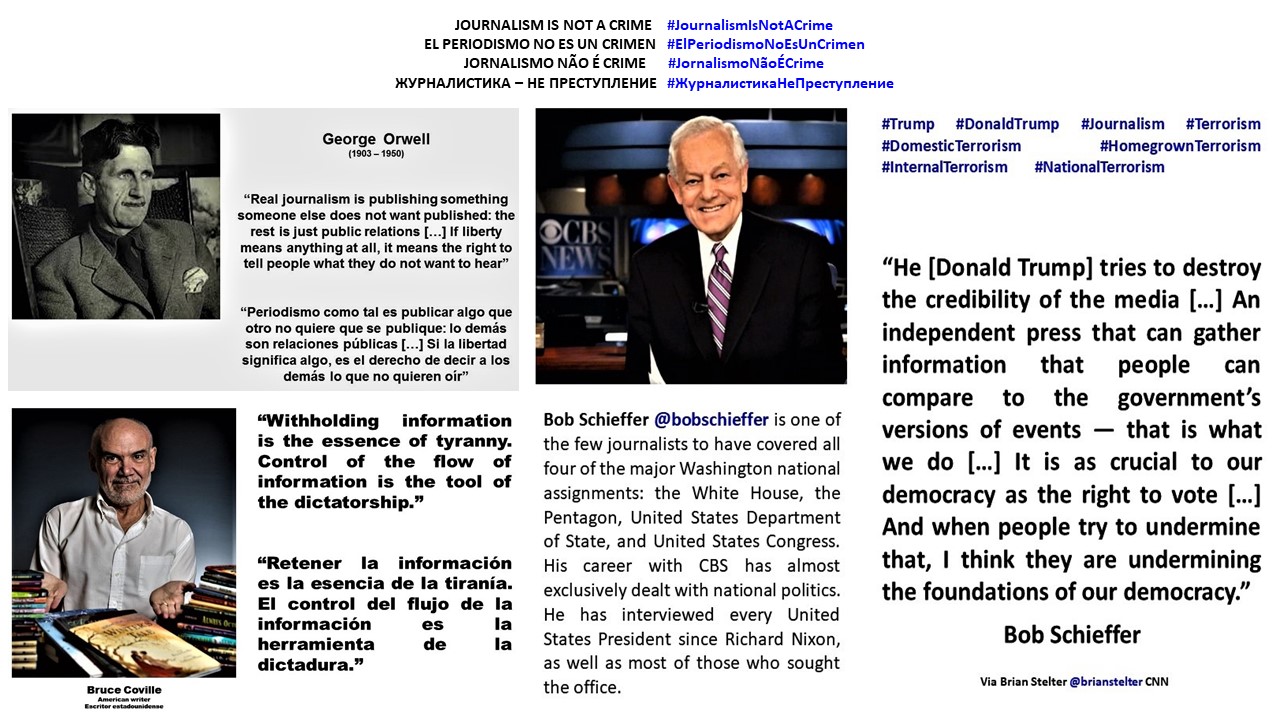 FERNANDO ANTONIO RUANO FAXAS. JOURNALISM IS NOT A CRIME. EL PERIODISMO NO ES UN CRIMEN. GEORGE ORWELL. BRUCE COVILLE. BOB SCHIEFFER. TRUMP, ELECTION, RUSSIA, PUTIN, MUELLER, TERRORISM, TERRORISMO