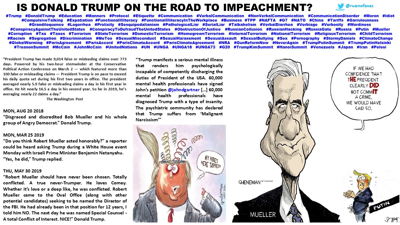 ← back to “#FakeNews #FactsFirst. No es nada nuevo el que Donald Trump ataque a Robert Mueller. Trump ataca a todos y a todo, más tarde o más temprano, y más ahora, que está acorralado, que está desesperado, que está atrapado en su propio laberinto infernal de mentiras, manipulaciones y contradicciones. Trump, por atacar, se ataca hasta a él mismo. “La historia de Trump es tan repugnante como su imagen, como su comportamiento corporal y verbal, torpe y falto de los protocolos elementales de la civilización occidental desarrollada y educada, un comportamiento que hace muy evidente su analfabetismo funcional, su torpeza diplomática, su rusticidad social y su estado mental desajustado””