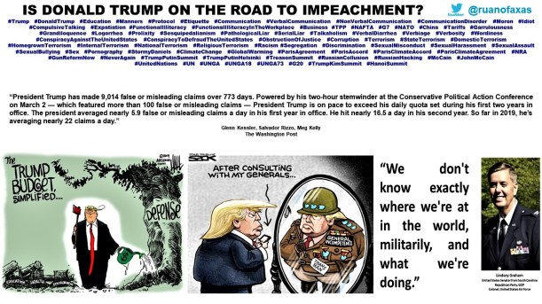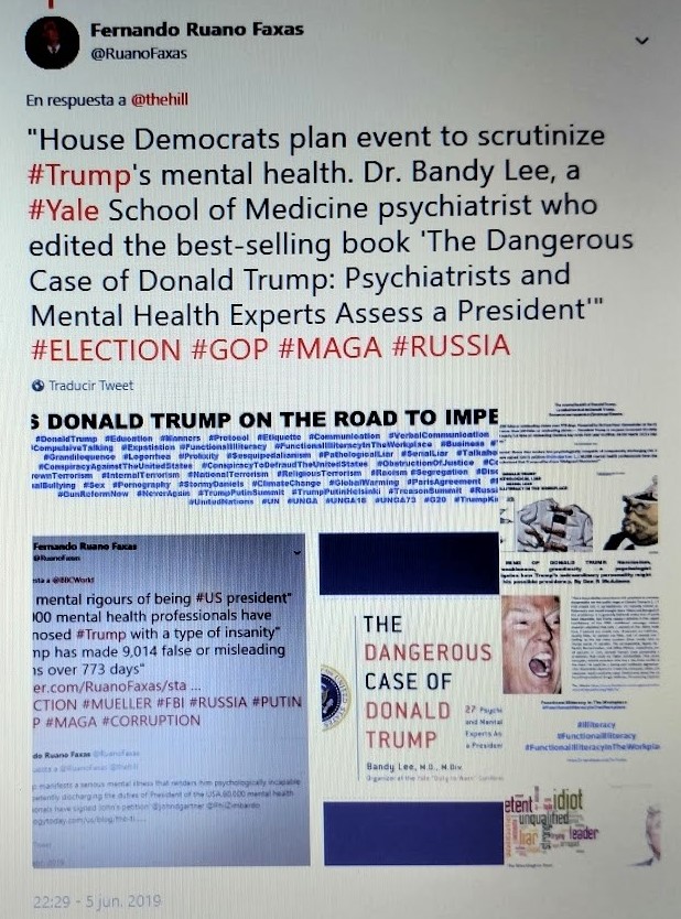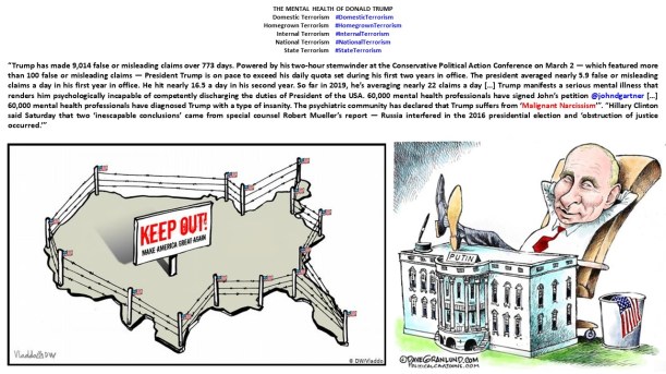 XXIII. Donald Trump en imágenes. Donald Trump in pictures. Donald Trump em imagens. Дональд Трамп в картинках. https://lnkd.in/ewKRn92 , https://lnkd.in/euWvjnk. “MOSCOW HAS NO CLUE WHAT TRUMP MEANT BY CLAIMING RUSSIA PULLED ‘THEIR PEOPLE’ OUT OF VENEZUELA. THE KREMLIN SAYS RUSSIAN SPECIALISTS ARE OPERATING IN VENEZUELA AS USUAL, AFTER US PRESIDENT DONALD TRUMP CLAIMED IN A TWEET THAT MOSCOW HAS PULLED ITS PEOPLE OUT OF THE CRISIS-HIT NATION. AMID A FRESH BATCH OF SOCIAL MEDIA POSTS ON MONDAY, TRUMP WROTE THAT RUSSIA HAD INFORMED WASHINGTON ABOUT HAVING ‘REMOVED MOST OF THEIR PEOPLE FROM VENEZUELA.’” “TRUMP CLAIMS HE NEVER CALLED MEGHAN MARKLE ‘NASTY,’ DEMANDS APOLOGY FROM CNN, EVEN THOUGH VIDEO EXISTS.” “WHILE PEOPLE OF BOTH GENDERS HAVE BEEN TAGGED WITH THE ADJECTIVE, TRUMP SEEMS TO MORE COMMONLY DESCRIBE WOMEN AS ‘NASTY’ THAN MEN: MEGHAN MARKLE, CARMEN YULÍN CRUZ, OMAROSA, KAMALA HARRIS, MAZIE HIRONO.” “‘I THINK WE CAN SEE THERE’S A PATTERN IN DONALD TRUMP THAT’S ANTI-FEMALE. HE’S BEEN SO VULGAR WITH HISPANIC AND FEMALE VOTERS’. HELEN AGUIRRE FERRÉ, WHITE HOUSE DIRECTOR OF MEDIA AFFAIRS.” “PRESIDENT TRUMP HAS MADE 9,014 FALSE OR MISLEADING CLAIMS OVER 773 DAYS. POWERED BY HIS TWO-HOUR STEMWINDER AT THE CONSERVATIVE POLITICAL ACTION CONFERENCE ON MARCH 2 — WHICH FEATURED MORE THAN 100 FALSE OR MISLEADING CLAIMS — PRESIDENT TRUMP IS ON PACE TO EXCEED HIS DAILY QUOTA SET DURING HIS FIRST TWO YEARS IN OFFICE. THE PRESIDENT AVERAGED NEARLY 5.9 FALSE OR MISLEADING CLAIMS A DAY IN HIS FIRST YEAR IN OFFICE. HE HIT NEARLY 16.5 A DAY IN HIS SECOND YEAR. SO FAR IN 2019, HE’S AVERAGING NEARLY 22 CLAIMS A DAY.” “TRUMP MANIFESTS A SERIOUS MENTAL ILLNESS THAT RENDERS HIM PSYCHOLOGICALLY INCAPABLE OF COMPETENTLY DISCHARGING THE DUTIES OF PRESIDENT OF THE USA. 60,000 MENTAL HEALTH PROFESSIONALS HAVE SIGNED JOHN’S PETITION @JOHNDGARTNER […] 60,000 MENTAL HEALTH PROFESSIONALS HAVE DIAGNOSED TRUMP WITH A TYPE OF INSANITY. THE PSYCHIATRIC COMMUNITY HAS DECLARED THAT TRUMP SUFFERS FROM ‘MALIGNANT NARCISSISM.’” “TRUMP: ‘THERE IS NO BASIS WHATSOEVER FOR IMPEACHMENT. NONE. THERE WAS NO COLLUSION. THERE WAS NO OBSTRUCTION. THERE WAS NO CRIME. THE CRIME WAS BY THE DEMOCRATS. THE CRIME WAS BY THE DEMOCRATS. THERE IS NO LEGAL BASIS FOR IMPEACHMENT. IT’S A BIG WITCH HUNT.’”