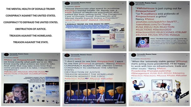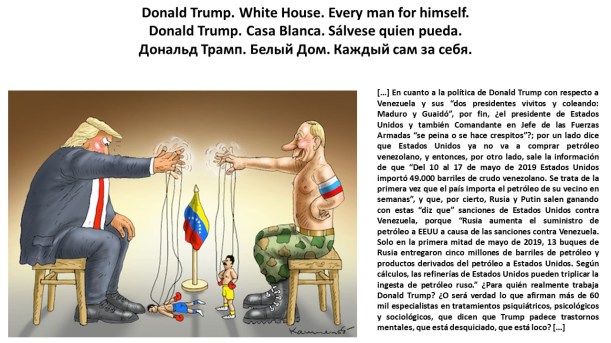 XIX. Donald Trump en imágenes. Donald Trump in pictures. Donald Trump em imagens. Дональд Трамп в картинках. https://lnkd.in/ewKRn92 , https://lnkd.in/euWvjnk. […] En cuanto a la política de Donald Trump con respecto a Venezuela y sus “dos presidentes vivitos y coleando: Maduro y Guaidó”, por fin, ¿el presidente de Estados Unidos y también Comandante en Jefe de las Fuerzas Armadas “se peina o se hace crespitos”?; por un lado dice que Estados Unidos ya no va a comprar petróleo venezolano, y entonces, por otro lado, sale la información de que “Del 10 al 17 de mayo de 2019 Estados Unidos importó 49.000 barriles de crudo venezolano. Se trata de la primera vez que el país importa el petróleo de su vecino en semanas”, y que, por cierto, Rusia y Putin salen ganando con estas “diz que” sanciones de Estados Unidos contra Venezuela, porque “Rusia aumenta el suministro de petróleo a EEUU a causa de las sanciones contra Venezuela. Solo en la primera mitad de mayo de 2019, 13 buques de Rusia entregaron cinco millones de barriles de petróleo y productos derivados del petróleo a Estados Unidos. Según cálculos, las refinerías de Estados Unidos pueden triplicar la ingesta de petróleo ruso.” ¿Para quién realmente trabaja Donald Trump? ¿O será verdad lo que afirman más de 60 mil especialistas en tratamientos psiquiátricos, psicológicos y sociológicos, que dicen que Trump padece trastornos mentales, que está desquiciado, que está loco? […]