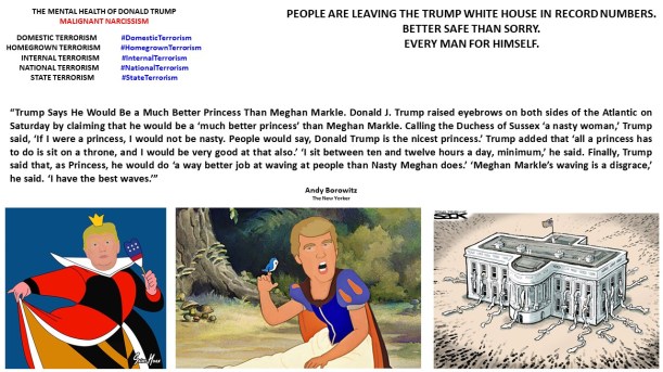 “Trump Says He Would Be a Much Better Princess Than Meghan Markle. Donald J. Trump raised eyebrows on both sides of the Atlantic on Saturday by claiming that he would be a ‘much better princess’ than Meghan Markle. Calling the Duchess of Sussex ‘a nasty woman,’ Trump said, ‘If I were a princess, I would not be nasty. People would say, Donald Trump is the nicest princess.’ Trump added that ‘all a princess has to do is sit on a throne, and I would be very good at that also.’ ‘I sit between ten and twelve hours a day, minimum,’ he said. Finally, Trump said that, as Princess, he would do ‘a way better job at waving at people than Nasty Meghan does.’ ‘Meghan Markle’s waving is a disgrace,’ he said. ‘I have the best waves.’”