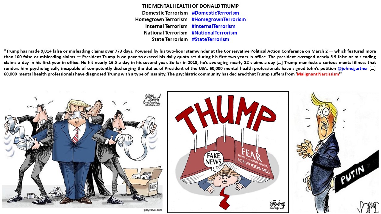 ← back to “XXIII. Donald Trump en imágenes. Donald Trump in pictures. Donald Trump em imagens. Дональд Трамп в картинках. https://lnkd.in/ewKRn92 , https://lnkd.in/euWvjnk. “MOSCOW HAS NO CLUE WHAT TRUMP MEANT BY CLAIMING RUSSIA PULLED ‘THEIR PEOPLE’ OUT OF VENEZUELA. THE KREMLIN SAYS RUSSIAN SPECIALISTS ARE OPERATING IN VENEZUELA AS USUAL, AFTER US PRESIDENT DONALD TRUMP CLAIMED IN A TWEET THAT MOSCOW HAS PULLED ITS PEOPLE OUT OF THE CRISIS-HIT NATION. AMID A FRESH BATCH OF SOCIAL MEDIA POSTS ON MONDAY, TRUMP WROTE THAT RUSSIA HAD INFORMED WASHINGTON ABOUT HAVING ‘REMOVED MOST OF THEIR PEOPLE FROM VENEZUELA.’” “TRUMP CLAIMS HE NEVER CALLED MEGHAN MARKLE ‘NASTY,’ DEMANDS APOLOGY FROM CNN, EVEN THOUGH VIDEO EXISTS.” “WHILE PEOPLE OF BOTH GENDERS HAVE BEEN TAGGED WITH THE ADJECTIVE, TRUMP SEEMS TO MORE COMMONLY DESCRIBE WOMEN AS ‘NASTY’ THAN MEN: MEGHAN MARKLE, CARMEN YULÍN CRUZ, OMAROSA, KAMALA HARRIS, MAZIE HIRONO.” “‘I THINK WE CAN SEE THERE’S A PATTERN IN DONALD TRUMP THAT’S ANTI-FEMALE. HE’S BEEN SO VULGAR WITH HISPANIC AND FEMALE VOTERS’. HELEN AGUIRRE FERRÉ, WHITE HOUSE DIRECTOR OF MEDIA AFFAIRS.” “PRESIDENT TRUMP HAS MADE 9,014 FALSE OR MISLEADING CLAIMS OVER 773 DAYS. POWERED BY HIS TWO-HOUR STEMWINDER AT THE CONSERVATIVE POLITICAL ACTION CONFERENCE ON MARCH 2 — WHICH FEATURED MORE THAN 100 FALSE OR MISLEADING CLAIMS — PRESIDENT TRUMP IS ON PACE TO EXCEED HIS DAILY QUOTA SET DURING HIS FIRST TWO YEARS IN OFFICE. THE PRESIDENT AVERAGED NEARLY 5.9 FALSE OR MISLEADING CLAIMS A DAY IN HIS FIRST YEAR IN OFFICE. HE HIT NEARLY 16.5 A DAY IN HIS SECOND YEAR. SO FAR IN 2019, HE’S AVERAGING NEARLY 22 CLAIMS A DAY.” “TRUMP MANIFESTS A SERIOUS MENTAL ILLNESS THAT RENDERS HIM PSYCHOLOGICALLY INCAPABLE OF COMPETENTLY DISCHARGING THE DUTIES OF PRESIDENT OF THE USA. 60,000 MENTAL HEALTH PROFESSIONALS HAVE SIGNED JOHN’S PETITION @JOHNDGARTNER […] 60,000 MENTAL HEALTH PROFESSIONALS HAVE DIAGNOSED TRUMP WITH A TYPE OF INSANITY. THE PSYCHIATRIC COMMUNITY HAS DECLARED THAT TRUMP SUFFERS FROM ‘MALIGNANT NARCISSISM.’” “TRUMP: ‘THERE IS NO BASIS WHATSOEVER FOR IMPEACHMENT. NONE. THERE WAS NO COLLUSION. THERE WAS NO OBSTRUCTION. THERE WAS NO CRIME. THE CRIME WAS BY THE DEMOCRATS. THE CRIME WAS BY THE DEMOCRATS. THERE IS NO LEGAL BASIS FOR IMPEACHMENT. IT’S A BIG WITCH HUNT.’””