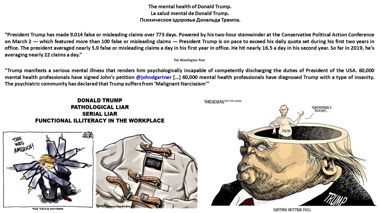 ← back to “XXIII. Donald Trump en imágenes. Donald Trump in pictures. Donald Trump em imagens. Дональд Трамп в картинках. https://lnkd.in/ewKRn92 , https://lnkd.in/euWvjnk. “MOSCOW HAS NO CLUE WHAT TRUMP MEANT BY CLAIMING RUSSIA PULLED ‘THEIR PEOPLE’ OUT OF VENEZUELA. THE KREMLIN SAYS RUSSIAN SPECIALISTS ARE OPERATING IN VENEZUELA AS USUAL, AFTER US PRESIDENT DONALD TRUMP CLAIMED IN A TWEET THAT MOSCOW HAS PULLED ITS PEOPLE OUT OF THE CRISIS-HIT NATION. AMID A FRESH BATCH OF SOCIAL MEDIA POSTS ON MONDAY, TRUMP WROTE THAT RUSSIA HAD INFORMED WASHINGTON ABOUT HAVING ‘REMOVED MOST OF THEIR PEOPLE FROM VENEZUELA.’” “TRUMP CLAIMS HE NEVER CALLED MEGHAN MARKLE ‘NASTY,’ DEMANDS APOLOGY FROM CNN, EVEN THOUGH VIDEO EXISTS.” “WHILE PEOPLE OF BOTH GENDERS HAVE BEEN TAGGED WITH THE ADJECTIVE, TRUMP SEEMS TO MORE COMMONLY DESCRIBE WOMEN AS ‘NASTY’ THAN MEN: MEGHAN MARKLE, CARMEN YULÍN CRUZ, OMAROSA, KAMALA HARRIS, MAZIE HIRONO.” “‘I THINK WE CAN SEE THERE’S A PATTERN IN DONALD TRUMP THAT’S ANTI-FEMALE. HE’S BEEN SO VULGAR WITH HISPANIC AND FEMALE VOTERS’. HELEN AGUIRRE FERRÉ, WHITE HOUSE DIRECTOR OF MEDIA AFFAIRS.” “PRESIDENT TRUMP HAS MADE 9,014 FALSE OR MISLEADING CLAIMS OVER 773 DAYS. POWERED BY HIS TWO-HOUR STEMWINDER AT THE CONSERVATIVE POLITICAL ACTION CONFERENCE ON MARCH 2 — WHICH FEATURED MORE THAN 100 FALSE OR MISLEADING CLAIMS — PRESIDENT TRUMP IS ON PACE TO EXCEED HIS DAILY QUOTA SET DURING HIS FIRST TWO YEARS IN OFFICE. THE PRESIDENT AVERAGED NEARLY 5.9 FALSE OR MISLEADING CLAIMS A DAY IN HIS FIRST YEAR IN OFFICE. HE HIT NEARLY 16.5 A DAY IN HIS SECOND YEAR. SO FAR IN 2019, HE’S AVERAGING NEARLY 22 CLAIMS A DAY.” “TRUMP MANIFESTS A SERIOUS MENTAL ILLNESS THAT RENDERS HIM PSYCHOLOGICALLY INCAPABLE OF COMPETENTLY DISCHARGING THE DUTIES OF PRESIDENT OF THE USA. 60,000 MENTAL HEALTH PROFESSIONALS HAVE SIGNED JOHN’S PETITION @JOHNDGARTNER […] 60,000 MENTAL HEALTH PROFESSIONALS HAVE DIAGNOSED TRUMP WITH A TYPE OF INSANITY. THE PSYCHIATRIC COMMUNITY HAS DECLARED THAT TRUMP SUFFERS FROM ‘MALIGNANT NARCISSISM.’” “TRUMP: ‘THERE IS NO BASIS WHATSOEVER FOR IMPEACHMENT. NONE. THERE WAS NO COLLUSION. THERE WAS NO OBSTRUCTION. THERE WAS NO CRIME. THE CRIME WAS BY THE DEMOCRATS. THE CRIME WAS BY THE DEMOCRATS. THERE IS NO LEGAL BASIS FOR IMPEACHMENT. IT’S A BIG WITCH HUNT.’””