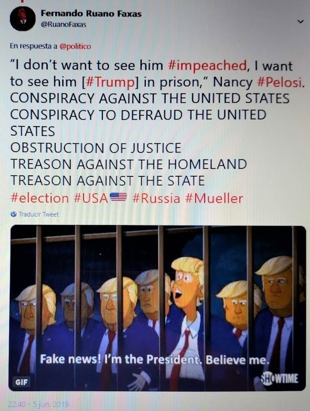 FERNANDO ANTONIO RUANO FAXAS. TWITTER. TRUMP, ELECTION, CORRUPTION, MUELLER, RUSSIA, PUTIN, LEADERSHIP, MANAGEMENT. I don’t want to see him impeached, I want to see him in prison. Nancy Pelosi