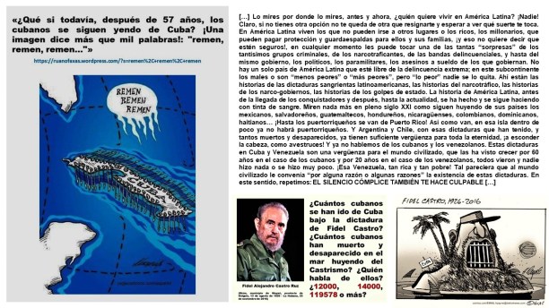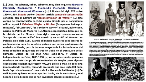 CUBA. CAMPOS DE CONCENTRACIÓN / CUBA. CONCENTRATION CAMPS / КУБА. КОНЦЕНТРАЦИОННЫЕ ЛАГЕРЯ […] Cuba, los cubanos, saben, sabemos, muy bien lo que es #Barbarie #Barbarity #Варварство / #Genocidio #Genocide #Геноцид / #Holocausto #Holocaust #Холокост […] A finales del siglo XIX, entre 1896 y 1898, España creó en Cuba un terrible campo de concentración conocido con el nombre de “Reconcentración de Weyler” […] este campo de concentración en Cuba estaba dirigido por el sanguinario militar español Valeriano Weyler y Nicolau, “El Carnicero”, “EL Carnicero Weyler”, español, palmesano, nacido en Palma de Mallorca […] Algunos especialistas dicen que en la historia de los últimos cinco siglos eso que conocemos como “campo de concentración” fue creado y se acuñó el término en Polonia, en el siglo XVIII, cuando el Imperio Ruso creó esos centros de confinamiento para los rebeldes polacos que serían posteriormente enviados a Siberia, pero la inmensa mayoría de los historiadores del tema coinciden en que esto se creó en Cuba, en el transcurso de las llamadas Guerra de los Diez Años, 1868-1878, y Guerra de Independencia de Cuba, 1895-1898 […] no se sabe cuántas personas murieron en este campo de concentración de Weyler, pero algunos especialistas estiman que fueron 400,000 civiles o más, es decir una inmensidad de muertos, tomando en cuenta que en el siglo XIX Cuba tenía “aproximadamente” menos de 2 millones de habitantes […] posteriormente, ya bajo el #Castrismo, en la dictadura de Fidel #Castro, en la llamada “La Revolución”, y concretamente entre 1965 y 1968, vuelve a aparecer en Cuba otro campo de concentración, con el nombre de “Unidades Militares de Ayuda a la Producción, UMAP”. ¿Cuántos seres humanos, hombres, jóvenes, pasaron por estos campos castristas de trabajo forzado? Nadie lo sabe “en detalles”, pero se estima que, como mínimo, fueron 30,000. ¿A quiénes internaba Fidel Castro en estos campos de concentración? Bueno, en realidad, ¡a quiénes no metían en la UMAP!, por lo que fuera o por lo que le pareciera a “La Revolución”, es decir a Fidel Castro: los que no querían ir al Servicio Militar, los que no estaban de acuerdo con Castro o “eso parecía”, es decir “la escoria”, “los gusanos”, “los antisociales”, los homosexuales o los que, según “La Revolución”, eran homosexuales, muchos que tenían sus creencias religiosas y no querían renunciar a ellas, los “líderes sociales” o “líderes grupales” que se quejaban por la escasez de alimentos y otros productos y criticaban el sistema de abastecimiento y la famosa “libreta”, los que no querían hacer las guardias nocturnas del “Comité”, los que querían “irse echando”, es decir los que querían irse de Cuba, en fin…, a “los conflictivos” […] ¡Y cuántos y cuántos intelectuales y artistas cubanos “cayeron” en la UMAP! […] Lo más “simpático” de todo esto es que esos “gusanos”, esos “antisociales”, esos “conflictivos”, en cuanto pudieron se fueron de Cuba, al exilio, principalmente a Estados Unidos, es decir “a 90”, a “La Yuma”, o a donde fuera, a donde se pudiera, y como fuera, y con los más que conocidos riesgos del exilio cubano, en especial el mar, morir ahogado, comido por tiburones, y hace mucho tiempo ya, años, que esos “gusanos”, “escoria”, son los que mandan las famosas “remesas” de dólares o euros o divisas a Cuba, gracias a lo cual “vive”, “subsiste”, toda Cuba y “los cubanos de adentro” […] En 2013 estas remesas de dólares a Cuba desde Estados Unidos fue de 2,497,031,206 , y estamos hablando no de millones, sino de billones, es decir millón de millones. Y esto, que conste, fue sólo el envío desde Estados Unidos, porque si sumamos el envío de todas las remesas de “los cubanos en el extranjero”, “los cubanos de afuera”, a Cuba, a “los cubanos de adentro”, entonces la cifra sería inmensísima: 2,777,363,411. ¿Ahora se entiende bien por qué y cómo subsisten Cuba y “los cubanos de adentro”? […] Y con respecto a “la eterna pregunta”, es decir ¿cuántos cubanos han “desaparecido” en el mar tratando de irse de Cuba? ¡Nadie sabe! ¿Quién sabe?: ¿12,000; 14,000; 119,578…? […]