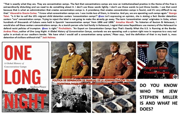 “That is exactly what they are. They are concentration camps. The fact that concentrations camps are now an institutionalized practice in the Home of the Free is extraordinarily disturbing and we need to do something about it. I don’t use those words lightly. I don’t use those words to just throw bombs. I use that word because that is what an administration that creates concentration camps is. A presidency that creates concentration camps is fascist, and it’s very difficult to say that.” Alexandria Ocasio-Cortez. “I know what concentration camps are. I was inside two of them, in America. And yes, we are operating such camps again.” George Takei. “Is it fair to call the US’s migrant child detention centers ‘concentration camps’? @AOC isn’t expressing an opinion, she is stating a fact: Border detention centers *are* concentration camps. Trying to reject the label is not going to make the atrocity go away. The term ‘concentration camp’ originates in Cuba, where hundreds of thousands of Cubans were held in Spanish ‘reconcentration camps’ from 1896 and 1898.” Annalisa Merelli. “As historian of fascism & Holocaust, I would also call these centers concentrations camps. As a Jewish person who lost family in Holocaust, I regret that some Republicans use memory of the Holocaust to defend racist policies of trumpism. @AOC is right.” Finchelstein. “An Expert on Concentration Camps Says That’s Exactly What the U.S. Is Running at the Border. Andrea Pitzer, author of One Long Night: A Global History of Concentration Camps, contends we are operating such a system right now in response to a very real spike in arrivals at our southern border. ‘We have what I would call a concentration camp system,’ Pitzer says, ‘and the definition of that in my book is, mass detention of civilians without trial.’” Jack Holmes.