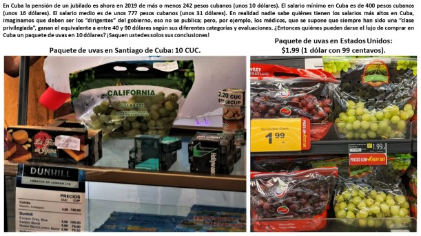 En Cuba la pensión de un jubilado es ahora en 2019 de más o menos 242 pesos cubanos (unos 10 dólares). El salario mínimo en Cuba es de 400 pesos cubanos (unos 16 dólares). El salario medio es de unos 777 pesos cubanos (unos 31 dólares). En realidad nadie sabe quiénes tienen los salarios más altos en Cuba, imaginamos que deben ser los “dirigentes” del gobierno, eso no se publica; pero, por ejemplo, los médicos, que se supone que siempre han sido una “clase privilegiada”, ganan el equivalente a entre 40 y 90 dólares mensuales según sus diferentes categorías y evaluaciones. ¿Entonces quiénes pueden darse el lujo de comprar en Cuba un paquete de uvas en 10 dólares? ¡Saquen ustedes solos sus conclusiones!