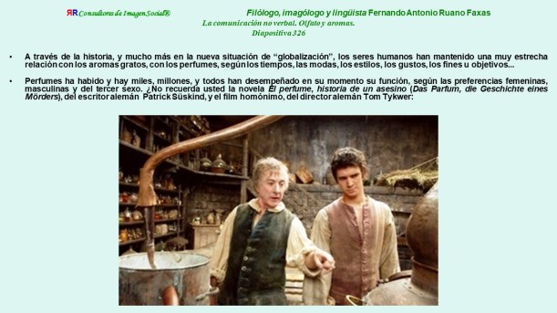 [431] Para considerar los alcances imaginarios del lenguaje olfativo del amor, pueden verse los siguientes filmes: Perfume, del director Tom Tykwer y Perfume de mujer (Profumo di donna), del director italiano Dino Rosi o del director estadounidense (Scent of a Woman) Martin Brest.