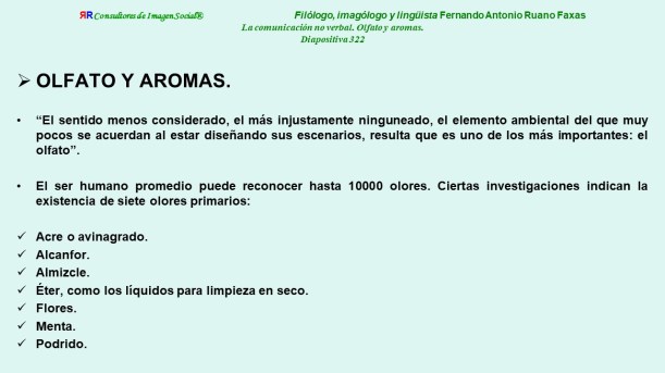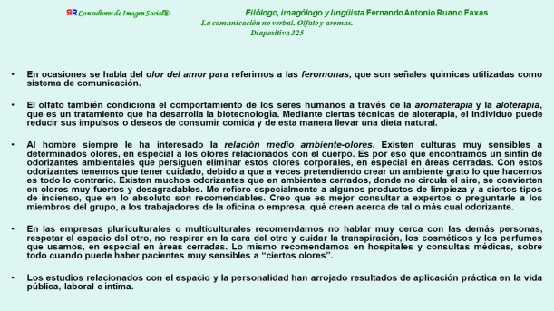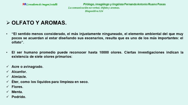CAPÍTULO XII. OLFATO Y AROMAS. Este capítulo en algunas versiones de las ediciones anteriores de mi libro EL LENGUAJE CORPORAL HUMANO. UN ENFOQUE IMAGOLÓGICO EN BASE A CRITERIOS VERBALES Y NO VERBALES. APUNTES PARA EL CURSO, con varias ediciones para la docencia universitaria, comenzando en 1991, aparece a partir de la página 551. Puede consultarse también https://ruanofaxas.com/2015/02/04/comunicacion-no-verbal-comunicacionnoverbal-nonverbal-communication-nonverbalcommunication-comunicacao-nao-verbal-comunicacaonaoverbal-%d0%bd%d0%b5%d0%b2%d0%b5%d1%80%d0%b1%d0%b0%d0%bb%d1%8c/