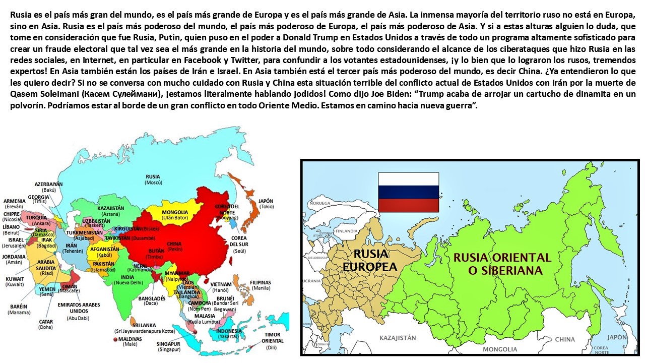 ← back to “Rusia es el país más grande del mundo, es el país más grande de Europa y es el país más grande de Asia. La inmensa mayoría del territorio ruso no está en Europa, sino en Asia. Rusia es el país más poderoso del mundo, el país más poderoso de Europa, el país más poderoso de Asia. Y si a estas alturas alguien lo duda, que tome en consideración que fue Rusia, Putin, quien puso en el poder a Donald Trump en Estados Unidos a través de todo un programa altamente sofisticado para crear un fraude electoral que tal vez sea el más grande en la historia del mundo, sobre todo considerando el alcance de los ciberataques que hizo Rusia en las redes sociales, en Internet, en particular en Facebook y Twitter, para confundir a los votantes estadounidenses, ¡y lo bien que lo lograron los rusos, tremendos expertos! En Asia también están los países de Irán e Israel. En Asia también está el tercer país más poderoso del mundo, es decir China. ¿Ya entendieron lo que les quiero decir? Si no se conversa con mucho cuidado con Rusia y China esta situación terrible del conflicto actual de Estados Unidos con Irán por la muerte de Qasem Soleimani (Касем Сулеймани), ¡estamos literalmente hablando jodidos! Como dijo Joe Biden: “Trump acaba de arrojar un cartucho de dinamita en un polvorín. Podríamos estar al borde de un gran conflicto en todo Oriente Medio. Estamos en camino hacia nueva guerra”.”