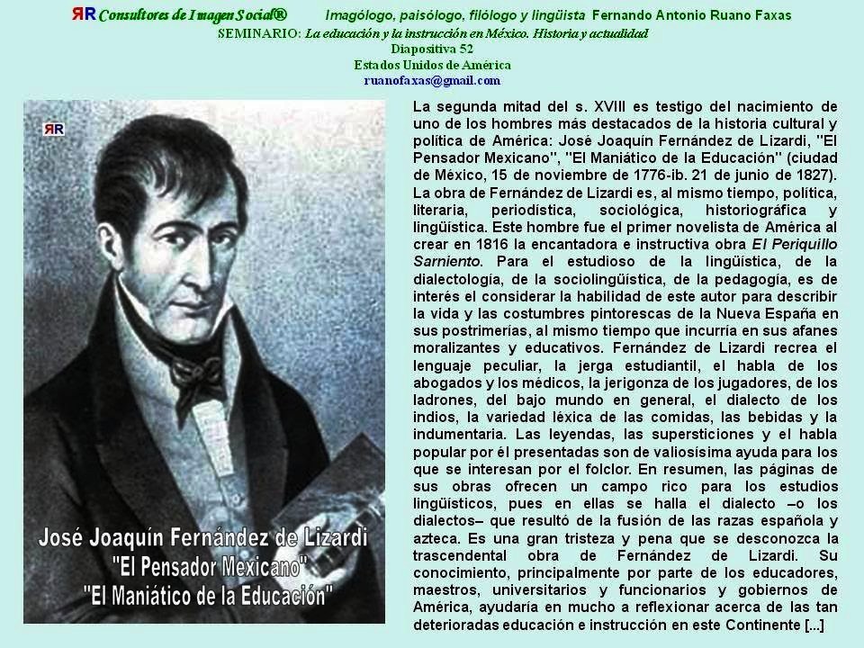 FERNANDO ANTONIO RUANO FAXAS. JOSÉ JOAQUÍN FERNÁNDEZ DE LIZARDI, EDUCACIÓN E INSTRUCCIÓN EN MÉXICO, CORRUPCIÓN Y ROBOS EN MÉXICO, PROTOCOLO Y ETIQUETA