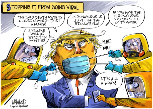 MIENTRAS LA ADMINISTRACIÓN DE ALIMENTOS Y MEDICAMENTOS (U.S. FOOD AND DRUG ADMINISTRATION, FDA) Y LOS CENTROS PARA EL CONTROL Y PREVENCIÓN DE ENFERMEDADES (CENTERS FOR DISEASE CONTROL AND PREVENTION, CDC) HAN DEJADO BIEN CLARO QUE LOS TAPABOCAS, MÁSCARAS, MASCARILLAS, NASOBUCOS, NO PUEDEN SER REUTILIZADOS, QUE NO SE PUEDEN LIMPIAR, DESINFECTAR Y LUEGO UTILIZAR, EL PRESIDENTE DE LA LLAMADA “PRIMERA POTENCIA DEL MUNDO”, ESTADOS UNIDOS, DONALD TRUMP, LE DICE A LOS MÉDICOS Y ENFERMERAS Y TRABAJADORES HOSPITALARIOS ESTADOUNIDENSES TODO LO CONTRARIO: “SUGIRIÓ EL SÁBADO QUE LOS TRABAJADORES DE LA SALUD DESINFECTEN Y REUTILICEN LAS MÁSCARAS CUANDO TRATAN A PACIENTES CON CORONAVIRUS, EN LUGAR DE DESECHAR LAS MÁSCARAS”. Y MUCHAS MÁS. EN LO QUE VA DE LAS 2 PRIMERAS SEMANAS DE MARZO TRUMP HA DICHO 33 MENTIRAS ACERCA DE LA PANDEMIA DE CORONAVIRUS.
