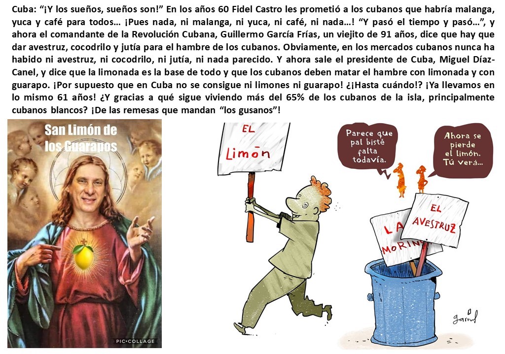 Fernando Antonio Ruano Faxas. Cuba, cubanos. Comida, hambre, escasez, desabasto, remesas. Fidel Castro, malanga, yuca, café. Guillermo García Frías, avestruz, cocodrilo, jutía. Miguel Díaz-Canel, limón, limonada, guarapo