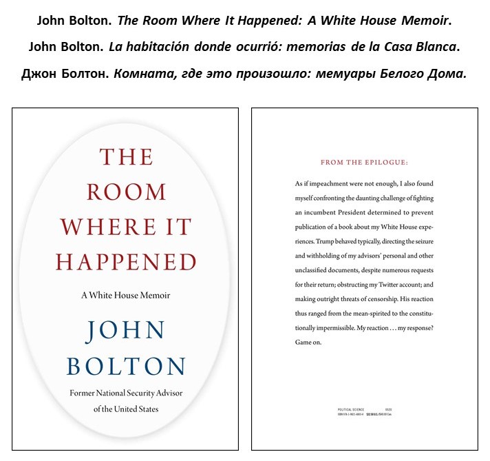 ← back to “John Bolton. “The Room Where It Happened: A White House Memoir.” John Bolton. “La habitación donde ocurrió: memorias de la Casa Blanca.” Джон Болтон. “Комната, где это произошло: мемуары Белого Дома.” / Mary Trump. “Too Much and Never Enough: How My Family Created the World’s Most Dangerous Man.” Mary Trump. “Demasiado y nunca suficiente: Cómo mi familia creó al hombre más peligroso del mundo.” Мэри Трамп. “Слишком много и никогда не достаточно: как моя семья создала самого опасного человека в мире.””