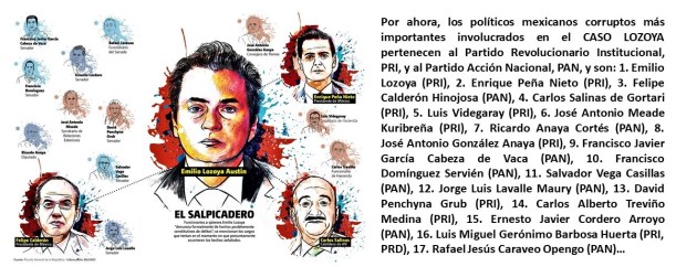 Por ahora, los políticos mexicanos corruptos más importantes involucrados en el CASO LOZOYA pertenecen al Partido Revolucionario Institucional, #PRI, y al Partido Acción Nacional, #PAN, y son: 1. Emilio #Lozoya (PRI), 2. Enrique #PeñaNieto #EPN (PRI), 3. Felipe #Calderón Hinojosa (PAN), 4. Carlos #Salinas de Gortari (PRI), 5. Luis #Videgaray (PRI), 6. José Antonio #Meade Kuribreña (PRI), 7. Ricardo #Anaya Cortés (PAN), 8. José Antonio #González Anaya (PRI), 9. Francisco Javier García #CabezaDeVaca (PAN), 10. Francisco #Domínguez Servién (PAN), 11. Salvador #Vega Casillas (PAN), 12. Jorge Luis #Lavalle Maury (PAN), 13. David #Penchyna Grub (PRI), 14. Carlos Alberto #Treviño Medina (PRI), 15. Ernesto Javier #Cordero Arroyo (PAN), 16. Luis Miguel Gerónimo #Barbosa Huerta (PRI, #PRD), 17. Rafael Jesús #Caraveo Opengo (PAN)…