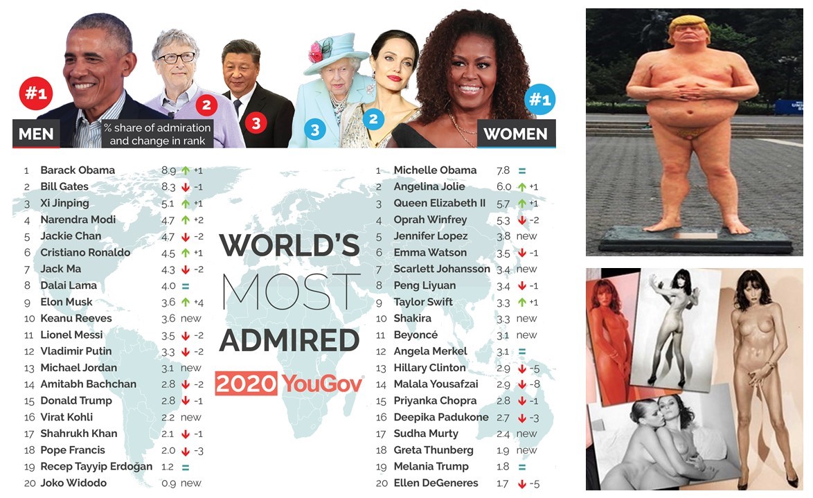 Leadership, Management. World’s most admired 2020. Barack Obama, Bill Gates, Xi Jinping, Michelle Obama, Angelina Jolie, Queen Elizabeth II. Election, GOP, MAGA, Donald Trump, Melania Trump, Russia, Putin, Ukraine, Nobel