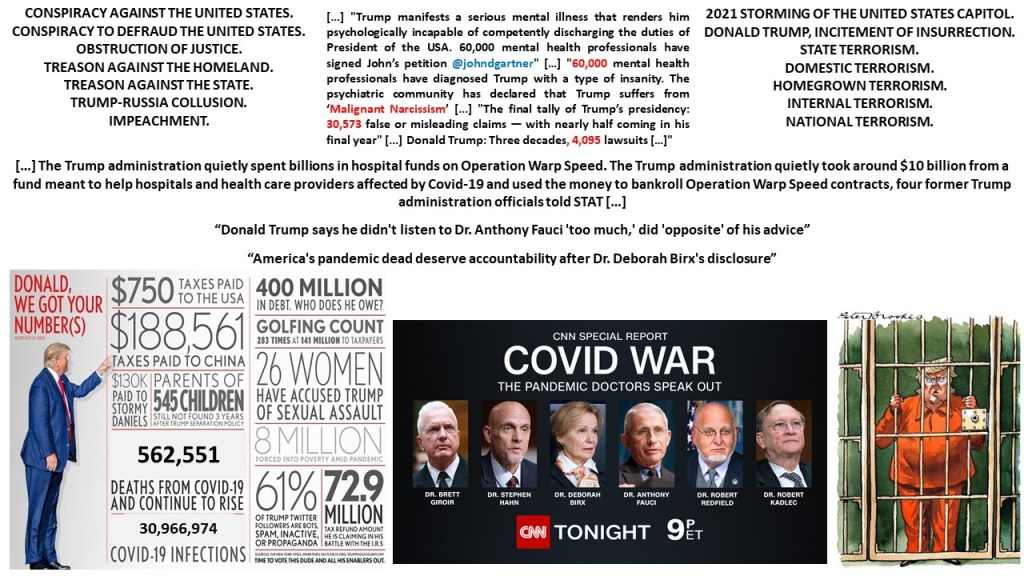CORONAVIRUS, COVID-19. “Donald Trump, The World’s Most Dangerous Man”. “Donald Trump says he didn’t listen to Dr. Anthony Fauci ‘too much,’ did ‘opposite’ of his advice”. “America’s pandemic dead deserve accountability after Dr. Deborah Birx’s disclosure”