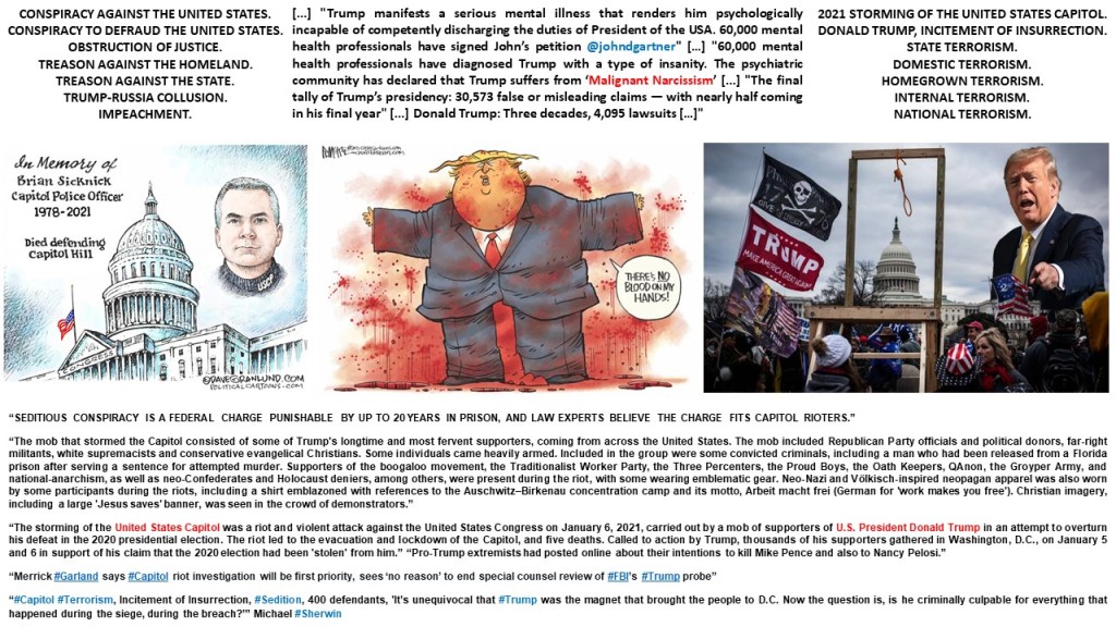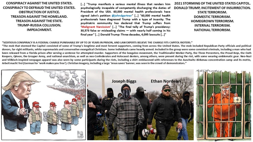 “The mob that stormed the Capitol consisted of some of Trump’s longtime and most fervent supporters, coming from across the United States. The mob included Republican Party officials and political donors, far-right militants, white supremacists and conservative evangelical Christians. Some individuals came heavily armed. Included in the group were some convicted criminals, including a man who had been released from a Florida prison after serving a sentence for attempted murder. Supporters of the boogaloo movement, the Traditionalist Worker Party, the Three Percenters, the Proud Boys, the Oath Keepers, QAnon, the Groyper Army, and national-anarchism, as well as neo-Confederates and Holocaust deniers, among others, were present during the riot, with some wearing emblematic gear. Neo-Nazi and Völkisch-inspired neopagan apparel was also worn by some participants during the riots, including a shirt emblazoned with references to the Auschwitz–Birkenau concentration camp and its motto, Arbeit macht frei (German for ‘work makes you free’). Christian imagery, including a large ‘Jesus saves’ banner, was seen in the crowd of demonstrators.”
