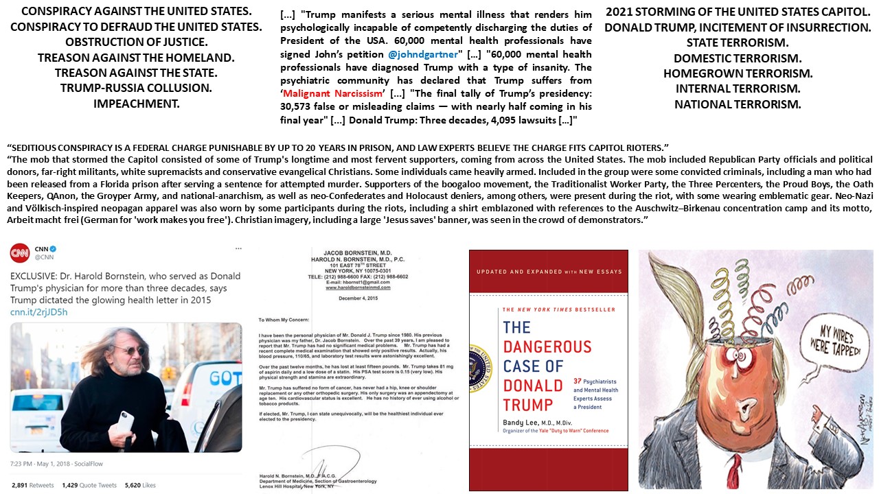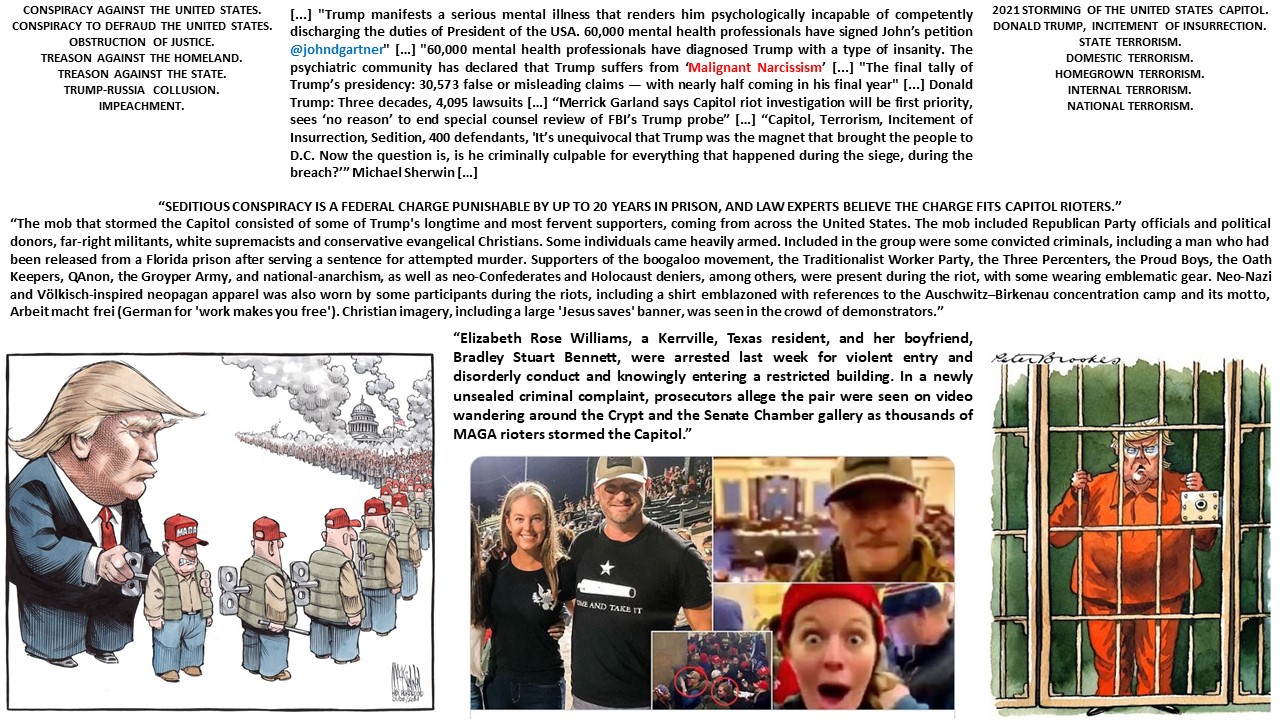 “The mob that stormed the Capitol consisted of some of Trump’s longtime and most fervent supporters, coming from across the United States. The mob included Republican Party officials and political donors, far-right militants, white supremacists and conservative evangelical Christians. Some individuals came heavily armed. Included in the group were some convicted criminals, including a man who had been released from a Florida prison after serving a sentence for attempted murder. Supporters of the boogaloo movement, the Traditionalist Worker Party, the Three Percenters, the Proud Boys, the Oath Keepers, QAnon, the Groyper Army, and national-anarchism, as well as neo-Confederates and Holocaust deniers, among others, were present during the riot, with some wearing emblematic gear. Neo-Nazi and Völkisch-inspired neopagan apparel was also worn by some participants during the riots, including a shirt emblazoned with references to the Auschwitz–Birkenau concentration camp and its motto, Arbeit macht frei (German for ‘work makes you free’). Christian imagery, including a large ‘Jesus saves’ banner, was seen in the crowd of demonstrators.”