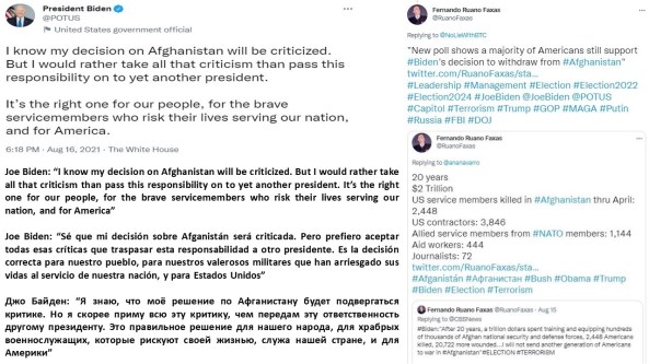 Джо Байден: “Я знаю, что моё решение по Афганистану будет подвергаться критике. Но я скорее приму всю эту критику, чем передам эту ответственность другому президенту. Это правильное решение для нашего народа, для храбрых военнослужащих, которые рискуют своей жизнью, служа нашей стране, и для Америки”