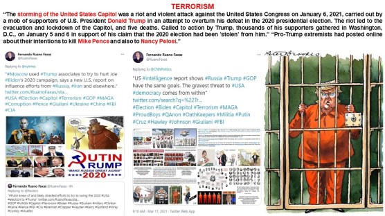 Es decir, para que quede claro, en estos momentos la mayor amenaza terrorista para Estados Unidos no es ni #ISIS #IS #EI #EIIL #ISIL #DAESH #ИГ #ИГИЛ, ni #AlQaeda, ni #Taliban, ni #BokoHaram, ni la frontera con #México (#Wall, #Muro), ni la “#migración ilegal”, o “espaldas-mojadas”, o “sin papeles”, ni nada por el estilo, sino los grupos de estadounidenses supremacistas blancos que ya están dentro de Estados Unidos. Y “para muestra, un botón”, el “Asalto al #Capitolio de los Estados Unidos de 2021″ (“2021 United States #Capitol attack”): https://twitter.com/search?q=%22Capitol%22%20(%40RuanoFaxas)&src=typed_query&f=live.