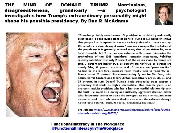 “There has probably never been a U.S. president as consistently and overtly disagreeable on the public stage as Donald Trump is […] Research shows that people low in agreeableness are typically viewed as untrustworthy. Dishonesty and deceit brought down Nixon and damaged the institution of the presidency. It is generally believed today that all politicians lie, or at least dissemble, but Trump appears extreme in this regard. Assessing the truthfulness of the 2016 candidates’ campaign statements, PolitiFact recently calculated that only 2 percent of the claims made by Trump are true, 7 percent are mostly true, 15 percent are half true, 15 percent are mostly false, 42 percent are false, and 18 percent are “pants on fire.” Adding up the last three numbers (from mostly false to flagrantly so), Trump scores 75 percent. The corresponding figures for Ted Cruz, John Kasich, Bernie Sanders, and Hillary Clinton, respectively, are 66, 32, 31, and 29 percent. In sum, Donald Trump’s basic personality traits suggest a presidency that could be highly combustible. One possible yield is an energetic, activist president who has a less than cordial relationship with the truth. He could be a daring and ruthlessly aggressive decision maker who desperately desires to create the strongest, tallest, shiniest, and most awesome result—and who never thinks twice about the collateral damage he will leave behind. Tough. Bellicose. Threatening. Explosive.” THE MIND OF DONALD TRUMP. Narcissism, disagreeableness, grandiosity —a psychologist investigates how Trump’s extraordinary personality might shape his possible presidency. By Dan P. McAdams.