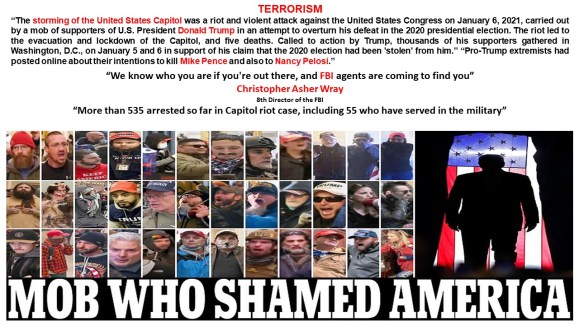 Part III. Terrorism, Terrorismo, Терроризм. “The September 11 attacks, 9/11, the deadliest terrorist attack in human history”. “Twenty years after 9-11 we still face the threat of extremism from sources foreign and domestic”. “WHAT A DIFFERENCE 20 YEARS MAKE”. “Donald Trump was not elected by the American people, either in 2016 or in 2020. Donald Trump was put in power by Putin, by Russia, by the Kremlin, by the Federal Security Service of the Russian Federation (FSB ФСБ, former KGB КГБ) […] January 6, 2021, domestic terrorist attack upon the United States Capitol Complex […] ‘Yes, Trump tried to stage a coup. Something unprecedented occurred after the Nov. 3 election: An incumbent president refused to recognize the results and, in fact, tried to overturn them. That effort culminated in another unprecedented event on Jan. 6: The president instigated a mob attack on the U.S. Capitol in the hope of stopping the vote certification’” […] Jimmy Carter, 39th President of the United States: “I think a full investigation would show that Trump didn’t actually win the election in 2016. He lost the election, and he was put into office because the Russians interfered on his behalf” […]