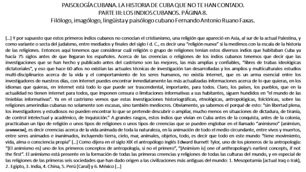 […] Y por supuesto que estos primeros indios cubanos no conocían el cristianismo, una religión que apareció en Asia, al sur de la actual Palestina, y como variante o secta del judaísmo, entre mediados y finales del siglo I d. C., es decir una “religión nueva” si la medimos con la escala de la historia de las religiones. Entonces aquí tenemos que considerar cuál religión o grupo de religiones tenían estos diversos indios que habitaban Cuba ya hacía 75 siglos antes de que llegaran los españoles. Acerca de las creencias o religiones de los indios cubanos tenemos que decir que las investigaciones que se han hecho y publicado antes del castrismo son las mejores, las más amplias y confiables, “libres de trabas ideológicas dictatoriales”, y eso que hace 60 años no existían las actuales técnicas de investigación tan desarrolladas y los amplios y multiculturales estudios multi-disciplinarios acerca de la vida y el comportamiento de los seres humanos, no existía Internet, que es un arma esencial entre los investigadores de nuestros días, con Internet puedes encontrar inmediatamente las más actualizadas informaciones acerca de lo que quieras, en los idiomas que quieras, en Internet está todo lo que puede ser trascendental, importante, para todos. Claro, los países, los pueblos, que en la actualidad no tienen Internet para todos, que imponen censura o limitaciones informativas a sus habitantes, siguen hundidos en “el mundo de las tinieblas informativas”. Ya en el castrismo vemos que estas investigaciones historiográficas, etnológicas, antropológicas, folclóricas, sobre las religiones amerindias cubanas no solamente son escasas, sino también mediocres. Obviamente, ya sabemos el porqué de esto: “sin libertad plena, los investigadores y estudiosos no pueden encontrar lo que se pretende descubrir o ampliar, mucho menos en situaciones de dictadura, de tiranía, de control intelectual y académico, de Inquisición.” A grandes rasgos, estos indios que vivían en Cuba antes de la conquista, antes de la colonia, practicaban un tipo de religión o unos tipos de religiones o unos tipos de creencias que se pueden englobar en el llamado “animismo” (animism, анимизм), es decir creencias acerca de la vida animada de toda la naturaleza, en la animación de todo el medio circundante, entre vivos y muertos, entre seres animados e inanimados, incluyendo tierra, cielo, mar, animales, objetos, todo, es decir que todo en este mundo “tiene movimiento, vida, alma o consciencia propia” […] Como dijera en el siglo XIX el antropólogo inglés Edward Burnett Tylor, uno de los pioneros de la antropología: “[El animismo es] uno de los primeros conceptos de antropología, si no el primero”, “[Animism is] one of anthropology’s earliest concepts, if not the first”. El animismo está presente en la formación de todas las primeras creencias y religiones de todas las culturas del mundo, y en especial de las religiones de las primeras seis sociedades que han dado origen a las civilizaciones más antiguas del mundo: 1. Mesopotamia (actual Iraq o Irak), 2. Egipto, 3. India, 4. China, 5. Perú (Caral) y 6. México […]