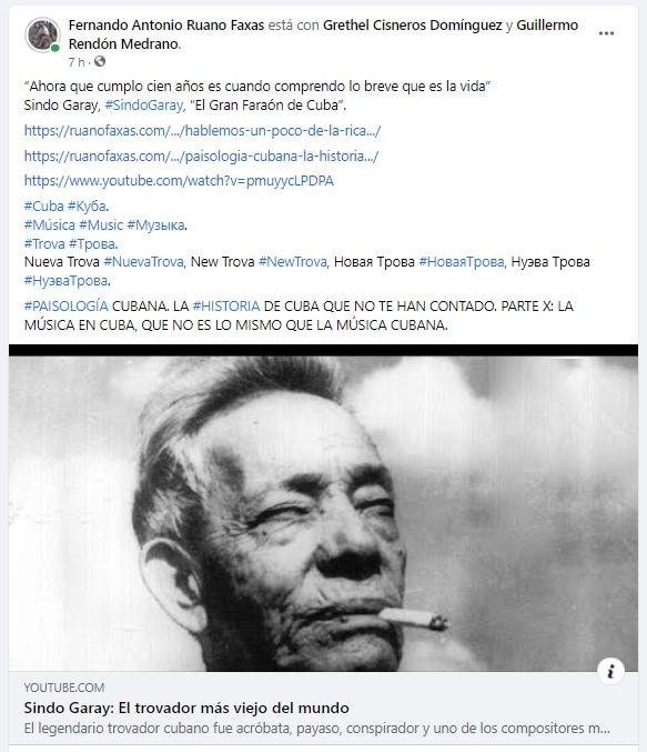Como he comentado ya en mi texto IMAGOLOGÍA DE LA MÚSICA EN AMÉRICA / IMAGOLOGY OF MUSIC IN AMERICA / ИМАГОЛОГИЯ МУЗЫКИ В АМЕРИКЕ: MÚSICA CUBANA, CUBAN MUSIC, КУБИНСКАЯ МУЗЫКА, KUBANISCHE MUSIK, 古巴音乐 https://ruanofaxas.com/2011/11/05/hablemos-un-poco-de-la-rica-musica-19j6x763f3uf8-98/ , la historia de la trova cubana es larga, sus orígenes se ubican aproximadamente para mediados del siglo XIX, en la provincia llamada Oriente, en la ciudad de Santiago de Cuba, y sus más representativos exponentes y fundadores son Pepe Sánchez, que es el creador del bolero cubano y que fue maestro de los trovadores que le siguieron, autor de “Tristezas”, Sindo Garay, que es el compositor de trovas más conocido mundialmente, autor de “Perla Marina”, José “Chicho” Ibáñez Noriega, que fue el primer trovador en especializarse en el “son”, en guaguancó y ritmos afrocubanos del abakuá, autor de “Toma mamá, que te manda tía”, Rosendo Ruiz, Manuel Corona y Alberto Villalón. Aunque José “Chicho” Ibáñez y otros trovadores fueron conocidos y valorados, en la historia de la música cubana se le llama “Los cuatro grandes de la trova” a Sindo Garay, Alberto Villalón, Rosendo Ruiz y Manuel Corona.