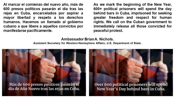 “Al marcar el comienzo del nuevo año, más de 600 presos políticos pasarán el día tras las rejas en Cuba, encarcelados por aspirar a mayor libertad y respeto a los derechos humanos. Hacemos un llamado al gobierno cubano a que libere a aquellos convictos por manifestarse pacíficamente.”