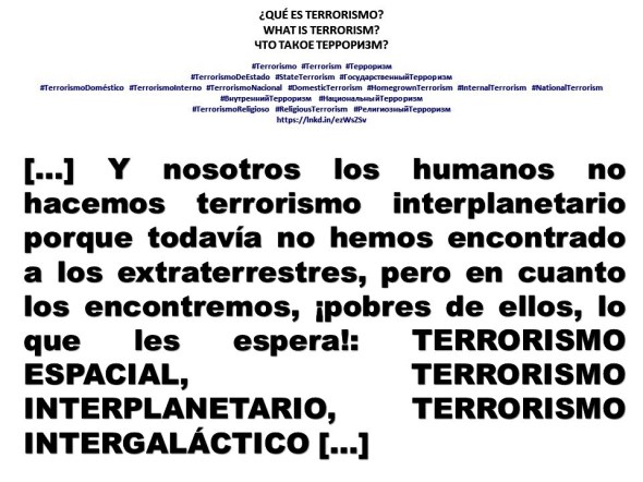[…] Y nosotros los humanos no hacemos terrorismo interplanetario porque todavía no hemos encontrado a los extraterrestres, pero en cuanto los encontremos, ¡pobres de ellos, lo que les espera!: TERRORISMO ESPACIAL, TERRORISMO INTERPLANETARIO, TERRORISMO INTERGALÁCTICO […]