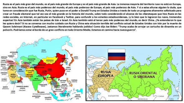 Rusia es el país más gran del mundo, es el país más grande de Europa y es el país más grande de Asia. La inmensa mayoría del territorio ruso no está en Europa, sino en Asia. Rusia es el país más poderoso del mundo, el país más poderoso de Europa, el país más poderoso de Asia. Y si a estas alturas alguien lo duda, que tome en consideración que fue Rusia, Putin, quien puso en el poder a Donald Trump en Estados Unidos a través de todo un programa altamente sofisticado para crear un fraude electoral que tal vez sea el más grande en la historia del mundo, sobre todo considerando el alcance de los ciberataques que hizo Rusia en las redes sociales, en Internet, en particular en Facebook y Twitter, para confundir a los votantes estadounidenses, ¡y lo bien que lo lograron los rusos, tremendos expertos! En Asia también están los países de Irán e Israel. En Asia también está el tercer país más poderoso del mundo, es decir China. ¿Ya entendieron lo que les quiero decir? Si no se conversa con mucho cuidado con Rusia y China esta situación terrible del conflicto actual de Estados Unidos con Irán por la muerte de Qasem Soleimani (Касем Сулеймани), ¡estamos literalmente hablando jodidos! Como dijo Joe Biden: “Trump acaba de arrojar un cartucho de dinamita en un polvorín. Podríamos estar al borde de un gran conflicto en todo Oriente Medio. Estamos en camino hacia nueva guerra”.