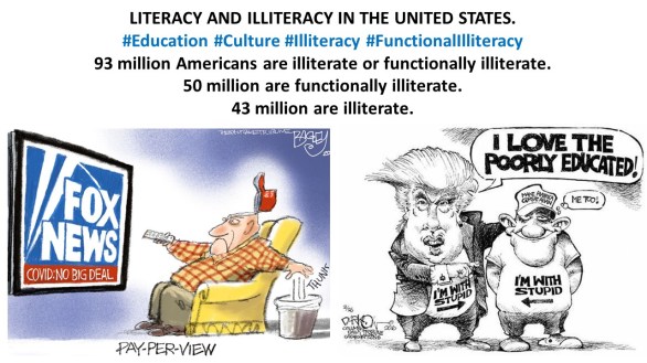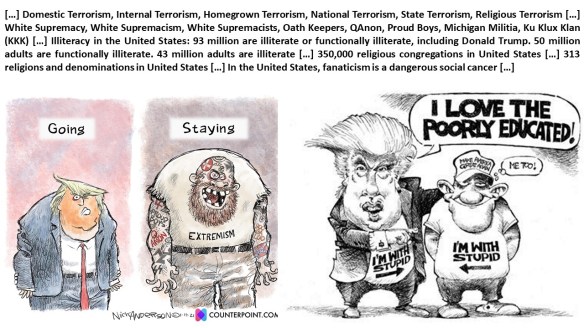 […] Domestic Terrorism, Internal Terrorism, Homegrown Terrorism, National Terrorism, State Terrorism, Religious Terrorism […] White Supremacy, White Supremacism, White Supremacists, Oath Keepers, QAnon, Proud Boys, Michigan Militia, Ku Klux Klan (KKK) […] Illiteracy in the United States: 93 million are illiterate or functionally illiterate, including Donald Trump. 50 million adults are functionally illiterate. 43 million adults are illiterate […] 350,000 religious congregations in United States […] 313 religions and denominations in United States […] In the United States, fanaticism is a dangerous social cancer […]