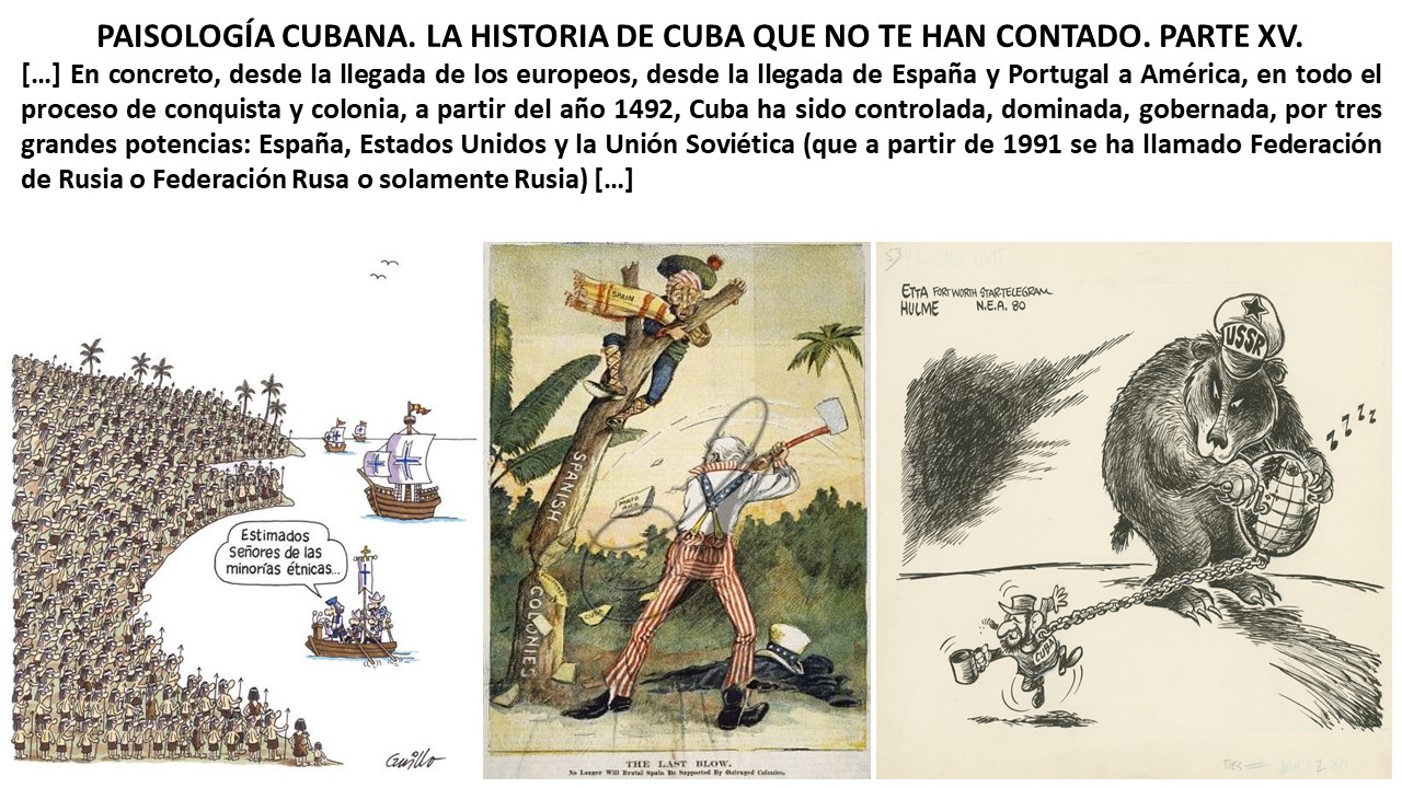 ← back to “PAISOLOGÍA CUBANA. LA HISTORIA DE CUBA QUE NO TE HAN CONTADO. PARTE XV. En concreto, desde la llegada de los europeos, desde la llegada de España y Portugal a América, en todo el proceso de conquista y colonia, a partir del año 1492, Cuba ha sido controlada, dominada, gobernada, por tres grandes potencias: España, Estados Unidos y la Unión Soviética (que a partir de 1991 se ha llamado Federación de Rusia o Federación Rusa o solamente Rusia). ¿Y qué pasó con la presencia de Inglaterra, Gran Bretaña, Reino Unido, en Cuba? ¡Por desgracia los ingleses, los británicos, se fueron de Cuba y en la isla se quedaron España y los españoles! ¡Miren cómo viven hoy las ex-colonias inglesas, británicas, y el mismo Reino Unido y cómo viven las ex-colonias españolas y la misma España! ¡Tétrico el asunto! ¡Y de mal en peor!”