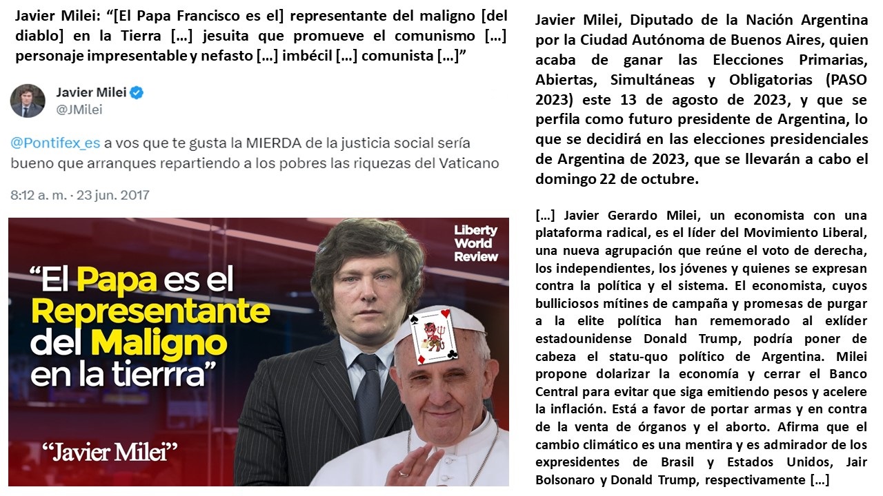 ← back to “[…] Elecciones en Argentina […] comportamiento, conducta, discurso, comunicación no verbal, comunicación verbal, imagen pública, imagen política, liderazgo, management…: Javier Milei me recuerda a Donald Trump (demencia, dementia, crazy, insane, verborrea, verborragia, verbal diarrhea, logorrea, logorrhea, trastorno de la comunicación, communication disorder, coprolalia, mentiroso patológico, pathological liar, mentiroso en serie, serial liar…), a Jair Bolsonaro, a Abdalá Bucaram “El Loco” […] ¿Javier Milei durará los 4 años establecidos en la presidencia de Argentina o lo destituirán por incompetencia gubernamental? ¿A Javier Milei los argentinos le aplicarán impeachment o destitución o proceso de destitución o juicio político mucho antes de terminar su mandato? ¿Habrá en Argentina una “peruanización”? ¿Cómo va a gobernar Milei, con sus “proyectos” e “ideas” que ni él mismo se los cree, tomando en cuenta la falta de gobernadores a su favor en el país y a la escasa representación en el Congreso argentino: “Está en minoría en las dos Cámaras parlamentarias y no tiene poder territorial. Ninguna de las 24 provincias de Argentina está gobernada por La Libertad Avanza (LLA), el partido fundado por Milei en 2021”? ¿Desde el punto de vista de política internacional y política regional, qué pasará con Argentina, cuando es más que evidente que la política del ultraderechista Javier Milei está estableciendo un evidente distanciamiento con la mayoría de los países de América, incluyendo a Estados Unidos y las tres economías más fuertes de América Latina: Brasil, México y Colombia? […] “En 2023 estamos viendo que en América Latina, que en Iberoamérica, que en Latinoamérica, Brasil, México, Colombia y Chile fueron las economías más beneficiadas” […] ¡Imagínense nada más que Argentina entre en conflicto abierto con China! “¡Ni modo, tiempo al tiempo!” ¡Pobre Argentina, “salir de Guatemala para entrar en Guatepeor”! […] Сумасшедшие у власти. Россия, Russia, Rusia: “Путин послан Богом” “Putin was sent by God”. The crazies in power. U.S.A.: “Trump was sent by God”. Os loucos no poder. Brasil, Brazil: “Bolsonaro foi enviado por Deus” “Bolsonaro was sent by God”. Los locos en el poder. Argentina: “Milei fue enviada por Dios” “Milei was sent by God” […]”