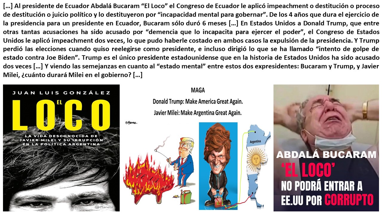 ← back to “[…] Elecciones en Argentina […] comportamiento, conducta, discurso, comunicación no verbal, comunicación verbal, imagen pública, imagen política, liderazgo, management…: Javier Milei me recuerda a Donald Trump (demencia, dementia, crazy, insane, verborrea, verborragia, verbal diarrhea, logorrea, logorrhea, trastorno de la comunicación, communication disorder, coprolalia, mentiroso patológico, pathological liar, mentiroso en serie, serial liar…), a Jair Bolsonaro, a Abdalá Bucaram “El Loco” […] ¿Javier Milei durará los 4 años establecidos en la presidencia de Argentina o lo destituirán por incompetencia gubernamental? ¿A Javier Milei los argentinos le aplicarán impeachment o destitución o proceso de destitución o juicio político mucho antes de terminar su mandato? ¿Habrá en Argentina una “peruanización”? ¿Cómo va a gobernar Milei, con sus “proyectos” e “ideas” que ni él mismo se los cree, tomando en cuenta la falta de gobernadores a su favor en el país y a la escasa representación en el Congreso argentino: “Está en minoría en las dos Cámaras parlamentarias y no tiene poder territorial. Ninguna de las 24 provincias de Argentina está gobernada por La Libertad Avanza (LLA), el partido fundado por Milei en 2021”? ¿Desde el punto de vista de política internacional y política regional, qué pasará con Argentina, cuando es más que evidente que la política del ultraderechista Javier Milei está estableciendo un evidente distanciamiento con la mayoría de los países de América, incluyendo a Estados Unidos y las tres economías más fuertes de América Latina: Brasil, México y Colombia? […] “En 2023 estamos viendo que en América Latina, que en Iberoamérica, que en Latinoamérica, Brasil, México, Colombia y Chile fueron las economías más beneficiadas” […] ¡Imagínense nada más que Argentina entre en conflicto abierto con China! “¡Ni modo, tiempo al tiempo!” ¡Pobre Argentina, “salir de Guatemala para entrar en Guatepeor”! […] Сумасшедшие у власти. Россия, Russia, Rusia: “Путин послан Богом” “Putin was sent by God”. The crazies in power. U.S.A.: “Trump was sent by God”. Os loucos no poder. Brasil, Brazil: “Bolsonaro foi enviado por Deus” “Bolsonaro was sent by God”. Los locos en el poder. Argentina: “Milei fue enviada por Dios” “Milei was sent by God” […]”
