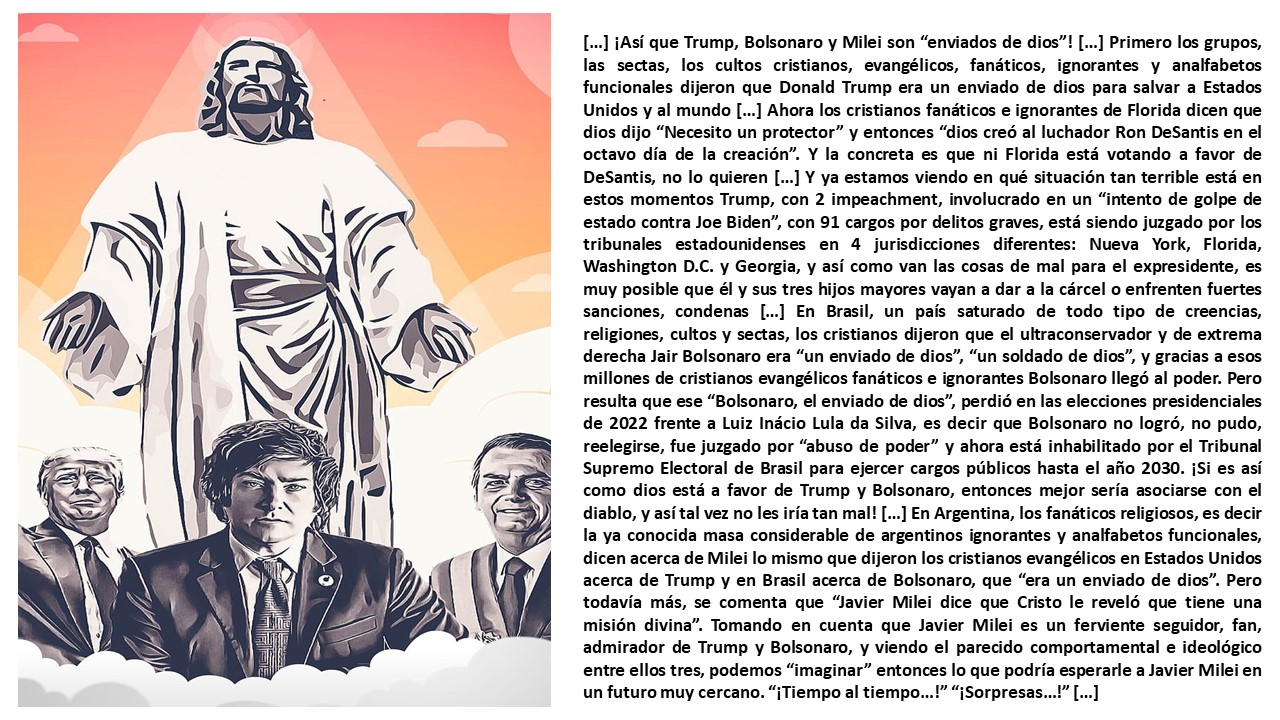← back to “[…] Elecciones en Argentina […] comportamiento, conducta, discurso, comunicación no verbal, comunicación verbal, imagen pública, imagen política, liderazgo, management…: Javier Milei me recuerda a Donald Trump (demencia, dementia, crazy, insane, verborrea, verborragia, verbal diarrhea, logorrea, logorrhea, trastorno de la comunicación, communication disorder, coprolalia, mentiroso patológico, pathological liar, mentiroso en serie, serial liar…), a Jair Bolsonaro, a Abdalá Bucaram “El Loco” […] ¿Javier Milei durará los 4 años establecidos en la presidencia de Argentina o lo destituirán por incompetencia gubernamental? ¿A Javier Milei los argentinos le aplicarán impeachment o destitución o proceso de destitución o juicio político mucho antes de terminar su mandato? ¿Habrá en Argentina una “peruanización”? ¿Cómo va a gobernar Milei, con sus “proyectos” e “ideas” que ni él mismo se los cree, tomando en cuenta la falta de gobernadores a su favor en el país y a la escasa representación en el Congreso argentino: “Está en minoría en las dos Cámaras parlamentarias y no tiene poder territorial. Ninguna de las 24 provincias de Argentina está gobernada por La Libertad Avanza (LLA), el partido fundado por Milei en 2021”? ¿Desde el punto de vista de política internacional y política regional, qué pasará con Argentina, cuando es más que evidente que la política del ultraderechista Javier Milei está estableciendo un evidente distanciamiento con la mayoría de los países de América, incluyendo a Estados Unidos y las tres economías más fuertes de América Latina: Brasil, México y Colombia? […] “En 2023 estamos viendo que en América Latina, que en Iberoamérica, que en Latinoamérica, Brasil, México, Colombia y Chile fueron las economías más beneficiadas” […] ¡Imagínense nada más que Argentina entre en conflicto abierto con China! “¡Ni modo, tiempo al tiempo!” ¡Pobre Argentina, “salir de Guatemala para entrar en Guatepeor”! […] Сумасшедшие у власти. Россия, Russia, Rusia: “Путин послан Богом” “Putin was sent by God”. The crazies in power. U.S.A.: “Trump was sent by God”. Os loucos no poder. Brasil, Brazil: “Bolsonaro foi enviado por Deus” “Bolsonaro was sent by God”. Los locos en el poder. Argentina: “Milei fue enviada por Dios” “Milei was sent by God” […]”
