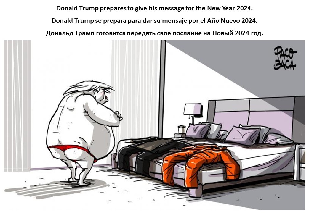 Ruano Faxas. Donald Trump prepares to give his message for the New Year 2024. 2 impeachment trials, 4 separate indictments, 91 charges and a slew of civil cases. Election, GOP, MAGA, Capitol, Mar a Lago, FBI, DOJ, IRS