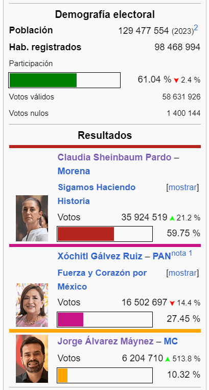 Según el INE – Instituto Nacional Electoral, en estas elecciones México 2024 en el padrón electoral había 98 millones 517 mil ciudadanos mexicanos registrados que podían votar, y finalmente solo votaron 59 millones 987 mil.