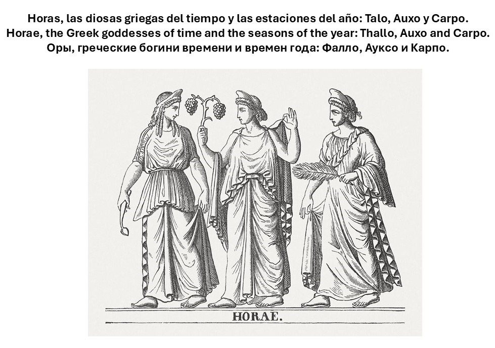 Así, por ejemplo, entre los dioses y diosas más conocidos que se relacionan con el tiempo, con el clima, con las estaciones del año, están las 3 diosas griegas (o más de ellas, no solamente 3, según los diferentes criterios de los historiadores e investigadores de varias ramas del conocimiento), hijas del más grande y principal dios de los griegos, Zeus (hijo de los dioses Cronos y Rea) y de la diosa Temis (hija de los dioses Urano y Gea), y los nombres de estas 3 “diosas del tiempo, del clima y de las estaciones del año”, llamadas “Horas” (Horae, Horai, Hours, Оры, Горы, Хоры) son: 1. Talo (Thallo, Фалло), la Hora de la Primavera, 2. Auxo (Auxesia, Ауксо), la Hora del Verano y 3. Carpo (Карпо), la Hora del Otoño y del Invierno. Aquí recordamos que para los griegos solamente existían 3 estaciones del año, y no 4, es decir que para ellos solamente existían Primavera, Verano y Otoño (es decir, frío).