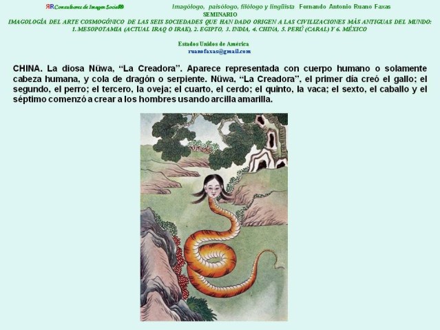 CHINA. La diosa Nüwa, “La Creadora”. Aparece representada con cuerpo humano o solamente cabeza humana, y cola de dragón o serpiente. Nüwa, “La Creadora”, el primer día creó el gallo; el segundo, el perro; el tercero, la oveja; el cuarto, el cerdo;