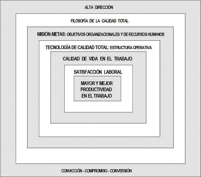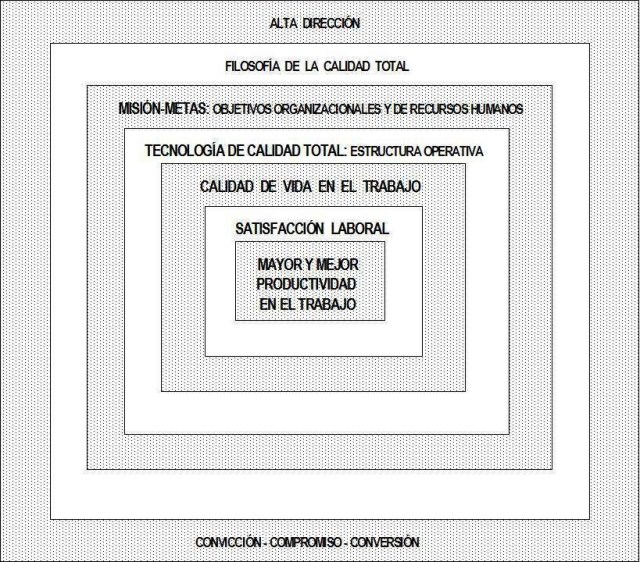La efectividad de todos estos aspectos se reflejará en el clima laboral. Para poder llevar a cabo este proceso de implantación de CVT en la empresa, es necesario que se realice una evaluación de la situación actual, donde se podrá determinar el grado de satisfacción de obreros y empleados respecto a su trabajo, empresa, lugar de actividades, jefes, compañeros y subordinados. Esto nos dará la pauta que nos servirá para determinar aquellos aspectos en los que estamos débiles y que a su vez son prioritarios para elevar la CVT de los recursos humanos. De acuerdo con lo anterior, podemos considerar que esta filosofía se basa en la premisa de ganar-ganar y no de que la ganancia de una de las partes sea por necesidad la pérdida de la otra. Lamentablemente, muchas veces se tiene la idea de que hablar de CVT implica por necesidad quitarle algo a la empresa para dárselo al empleado, razón por la que con frecuencia se tiende a dilatar su establecimiento o implantación. En realidad lo que sucede es todo lo contrario: la Calidad de Vida debe incluir efectividad del trabajo de todos los miembros de la organización, lo que hará más sana la situación productiva y financiera de ésta. En la figura siguiente se muestra la manera acerca de cómo se integra la CVT dentro de un sistema de Calidad Total.