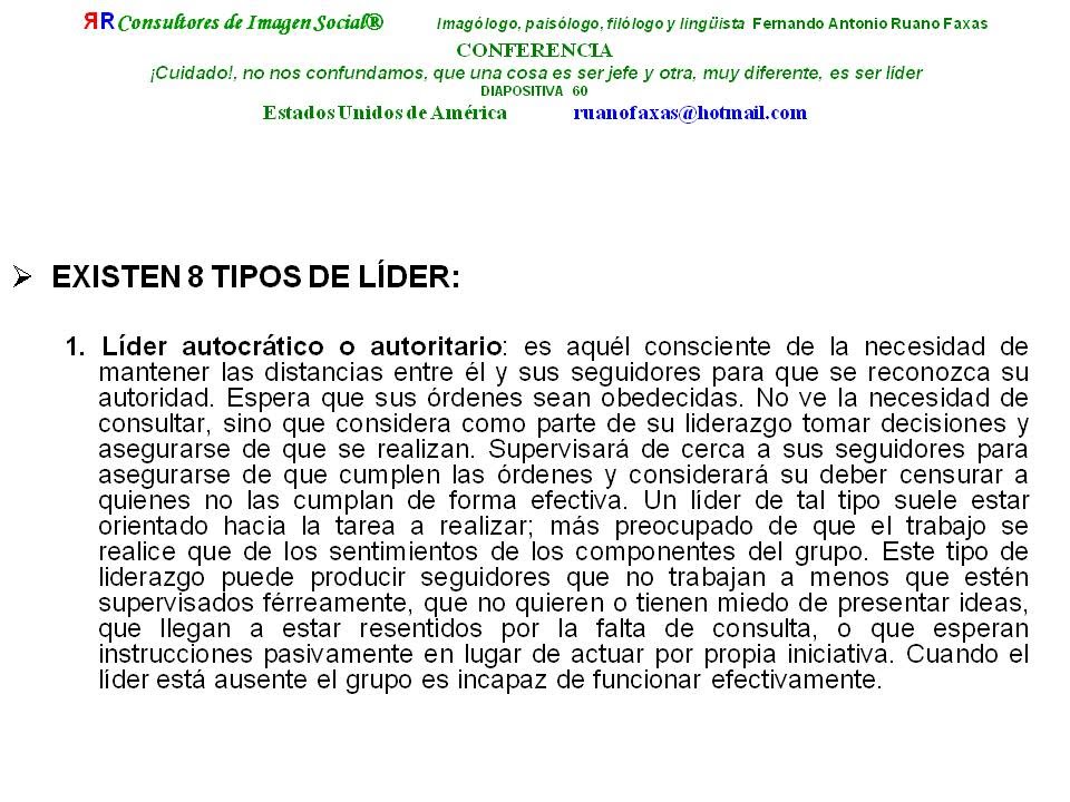 1. Líder autocrático o autoritario: es aquél consciente de la necesidad de mantener las distancias entre él y sus seguidores para que se reconozca su autoridad. Espera que sus órdenes sean obedecidas. No ve la necesidad de consultar, sino que considera como parte de su liderazgo tomar decisiones y asegurarse de que se realizan. Supervisará de cerca a sus seguidores para asegurarse de que cumplen las órdenes y considerará su deber censurar a quienes no las cumplan de forma efectiva. Un líder de tal tipo suele estar orientado hacia la tarea a realizar; más preocupado de que el trabajo se realice que de los sentimientos de los componentes del grupo. Este tipo de liderazgo puede producir seguidores que no trabajan a menos que estén supervisados férreamente, que no quieren o tienen miedo de presentar ideas, que llegan a estar resentidos por la falta de consulta, o que esperan instrucciones pasivamente en lugar de actuar por propia iniciativa. Cuando el líder está ausente el grupo es incapaz de funcionar efectivamente.